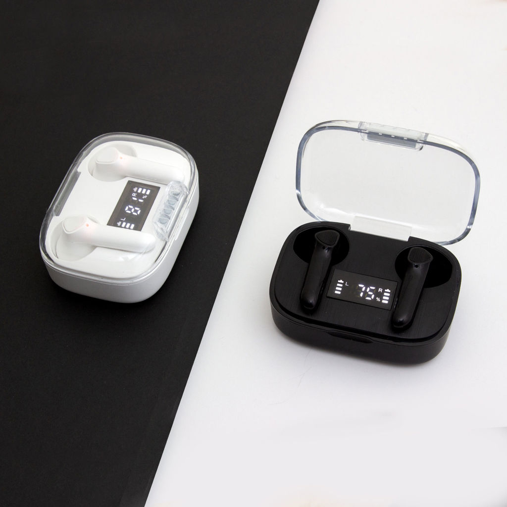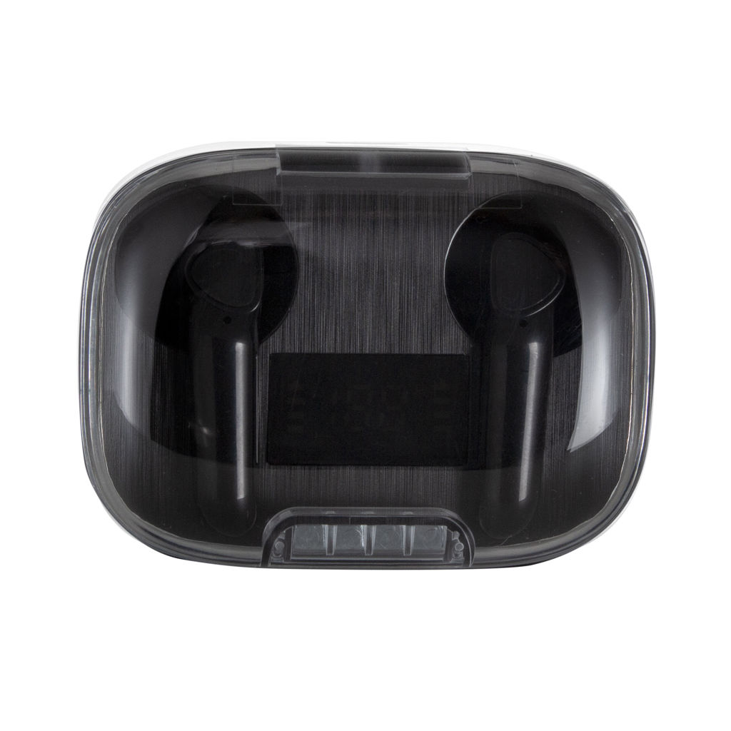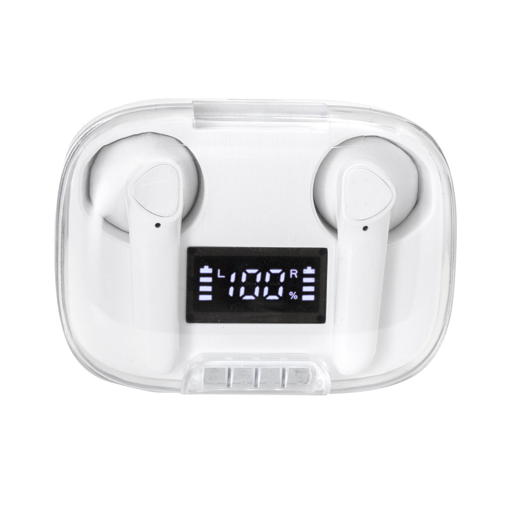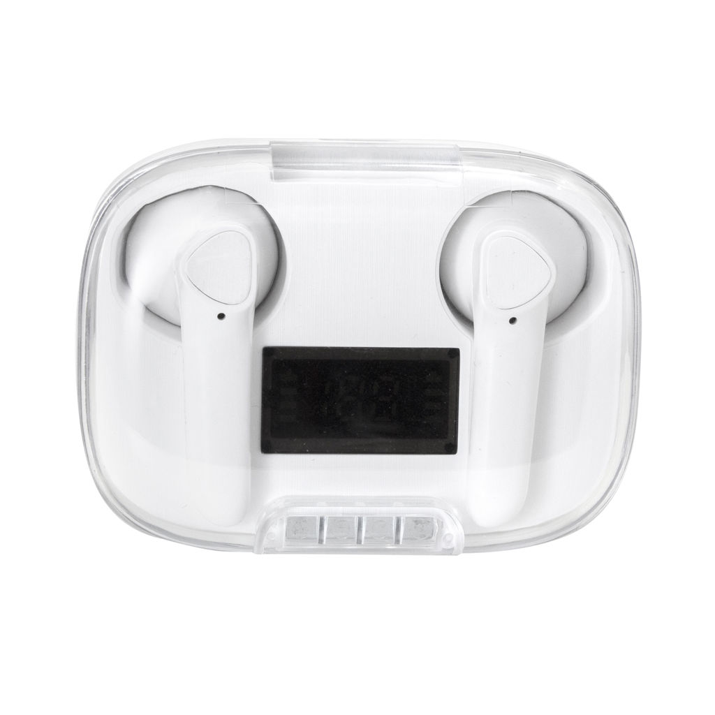 Sonido nítido, sin cablesAuriculares Bluethooth. Pantalla digital y tapa transparente. Rango de alcance: 15 metros. Tiempo de reproducción: aprox. 3 horas. Tiempo de Carga: 1 hora Duración de la carga en inactividad: 200 horas. Cable de carga USB tipo C en color blanco para auriculares blancos, y en color negro para la versión en negro. Medidas: 6 x 4,5 x 2,5 mm.