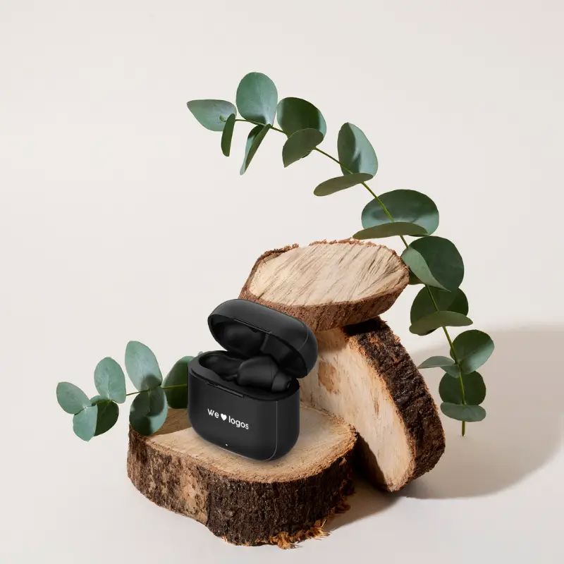 Auriculares inalámbricos fabricados en ABS reciclado. Cada auricular cuenta con un botón touch que permite contestar y finalizar llamadas, reproducir y pausar música, cambiar a la siguiente o anterior canción. Tienen tecnología Bluetooth 5.3, una duración de batería de aproximadamente 5 horas y un estuche de carga de 200 mAh, el cual se carga a través de un cable usb c. Los auriculares cuentan con almohadillas de diferentes tamaños, y viene dentro de una caja de cartón junto a su manual de instrucciones y cable cargador.