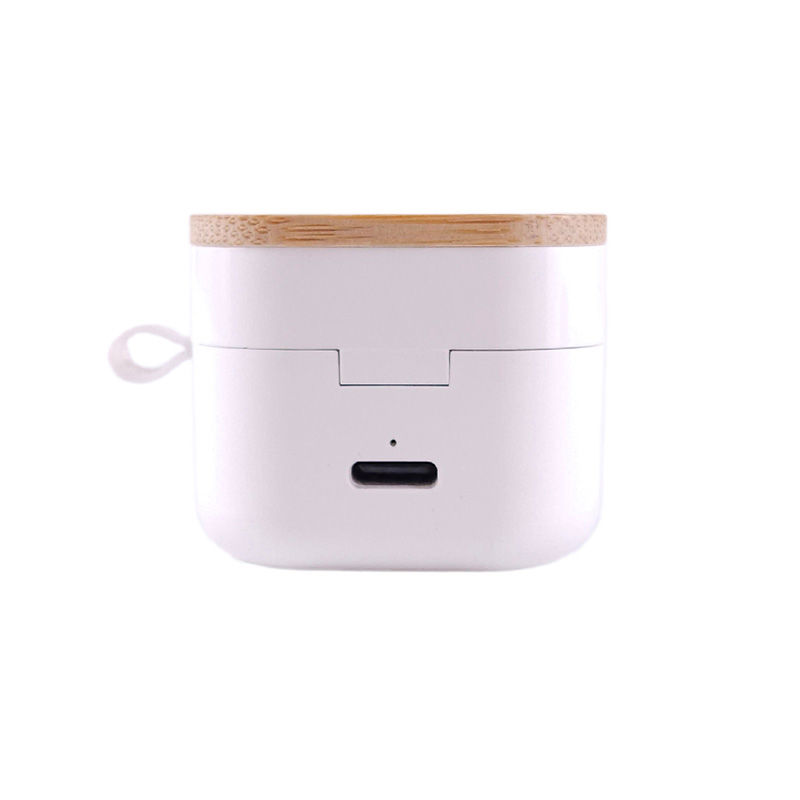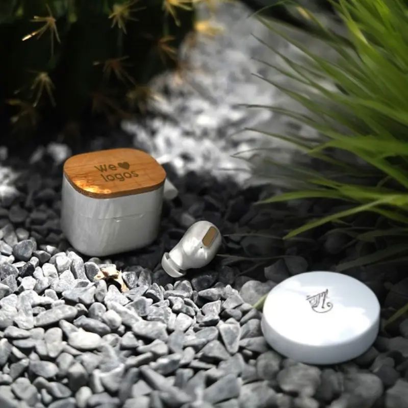 Auriculares inalámbricos fabricados en RABS, bambú y silicona. Cada auricular cuenta con un botón touch que permite contestar y finalizar llamadas, reproducir y pausar música, cambiar a la siguiente o anterior canción. Tienen tecnología Bluetooth 5.3, una duración de batería de aproximadamente 4 horas y un estuche de carga de 300 mAh, el cual se carga a través de un cable usb c. Los auriculares cuentan con almohadillas de diferentes tamaños.