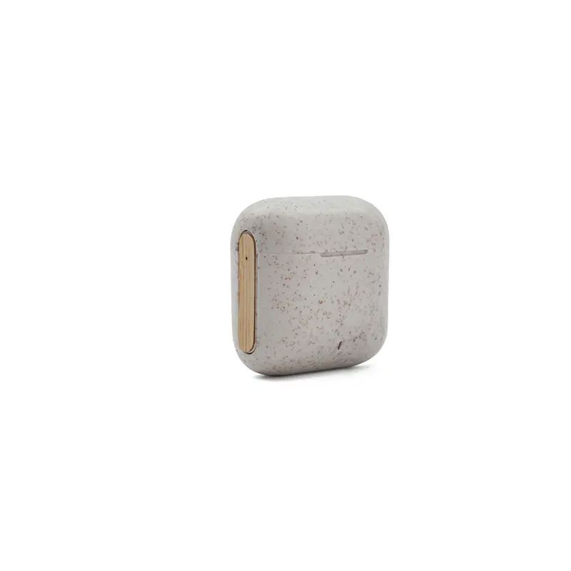 Auriculares inalámbricos fabricados en bambú, ABS y Wheat Straw, pasta de tallo de trigo, un material sustentable que reduce el consumo de plásticos vírgenes. Cada auricular cuenta con un botón touch que permite: contestar y finalizar llamadas, reproducir y pausar música, cambiar a la siguiente o anterior canción, subir y bajar el volumen y acceder al asistente de voz. Tienen tecnología Bluetooth 5.3, una duración de batería de aproximadamente 3.5 horas y un estuche de carga de 200 mAh, el cual se carga a través de un cable usb c. Los auriculares vienen dentro de una caja de cartón junto a su manual de instrucciones y cable cargador.