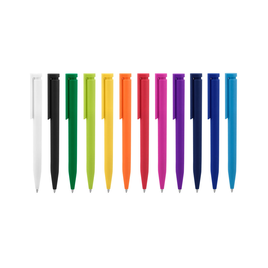 Plástico. Cuerpo de diferentes colores. Bolígrafo retráctil. Clip plástico del mismo color del cuerpo. Tinta negra. Sistema de botón push para destapar. Amplia área de impresión.