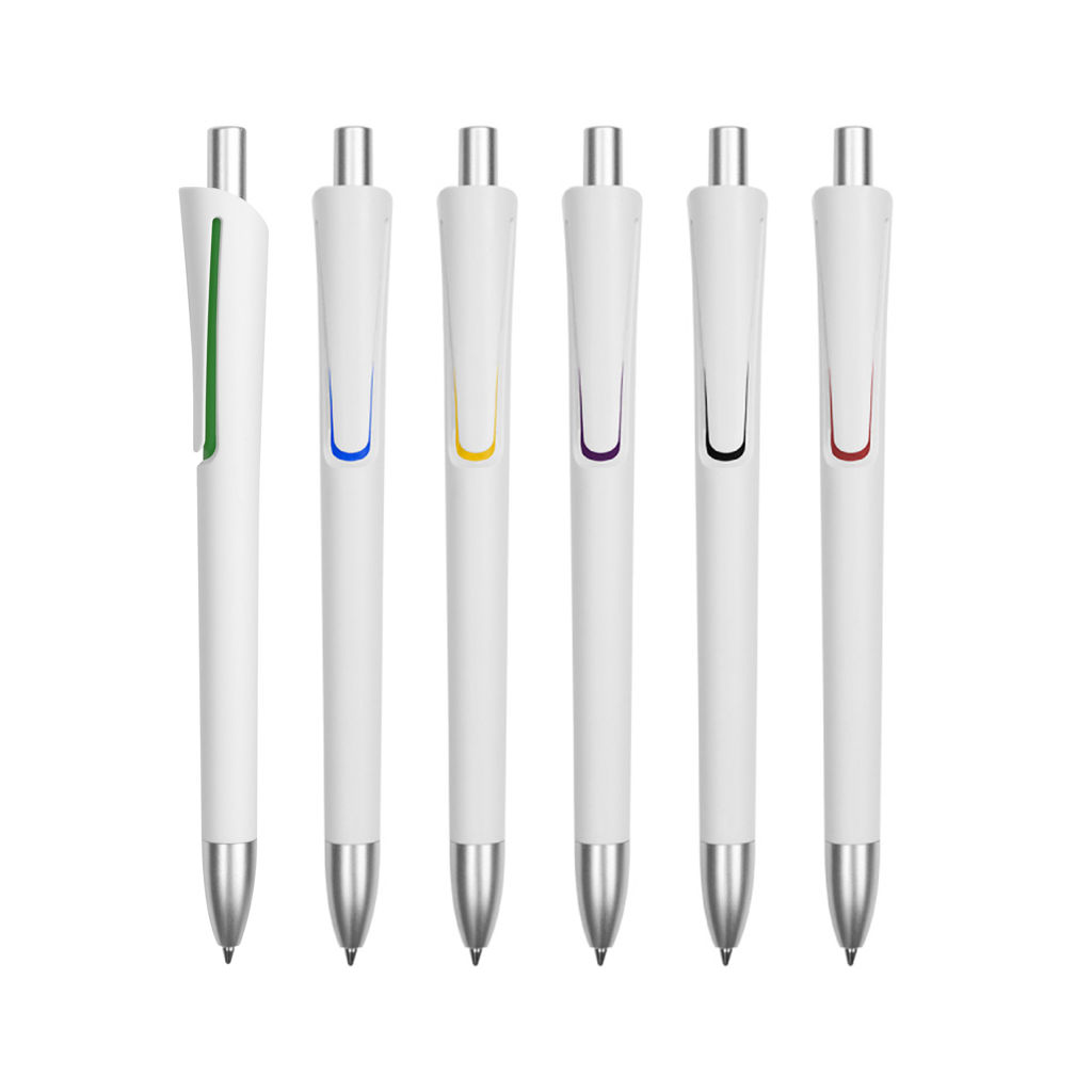 Plástico. Cuerpo blanco mate. Clip, puntera y pulsador color plata. Debajo del clip detalle de color. Tinta azul.