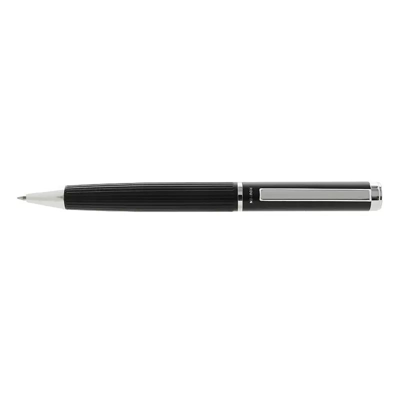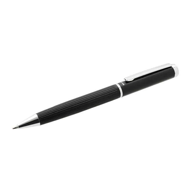 Bolígrafo de cuerpo metálico en acero con detalles en negro. Cuenta con tinta azul y apertura con medio giro. Medidas: 13,8 x 1,3 cm. Tinta Azul