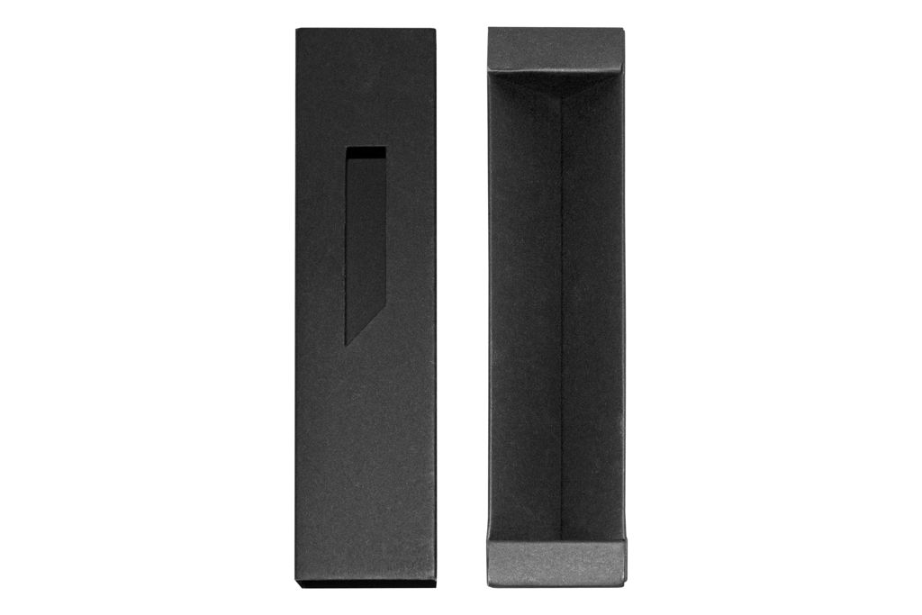 Metálico. Cuerpo color negro engomado. Clip, puntera y detalles en color plata. Apertura giratoria. Tinta negra. Con estuche de cartón. Destape electroplateado en la parte superior. Presentación en caja de regalo.
