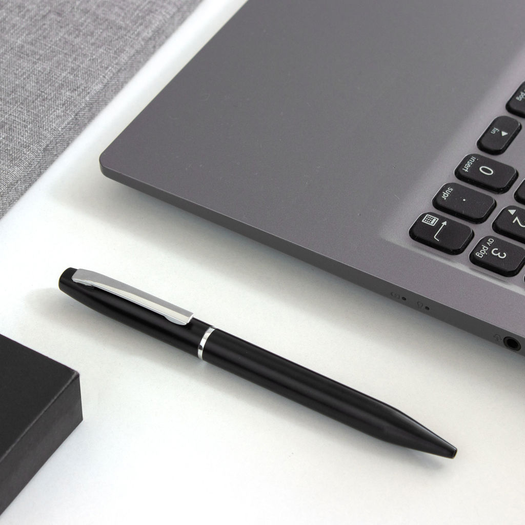 Transmite éxito en cada trazo.Bolígrafo con apertura giratoria. Cuerpo metálico en negro mate. Cuerpo de aluminio reciclado. Destape electroplateado en la parte superior. Recarga metálica. Clip y anillos metálicos color plata.