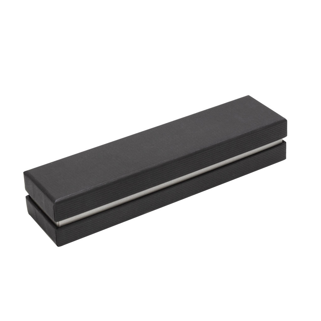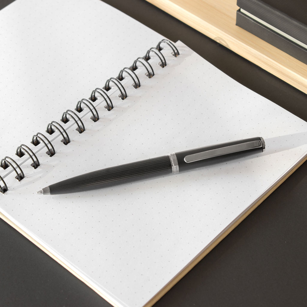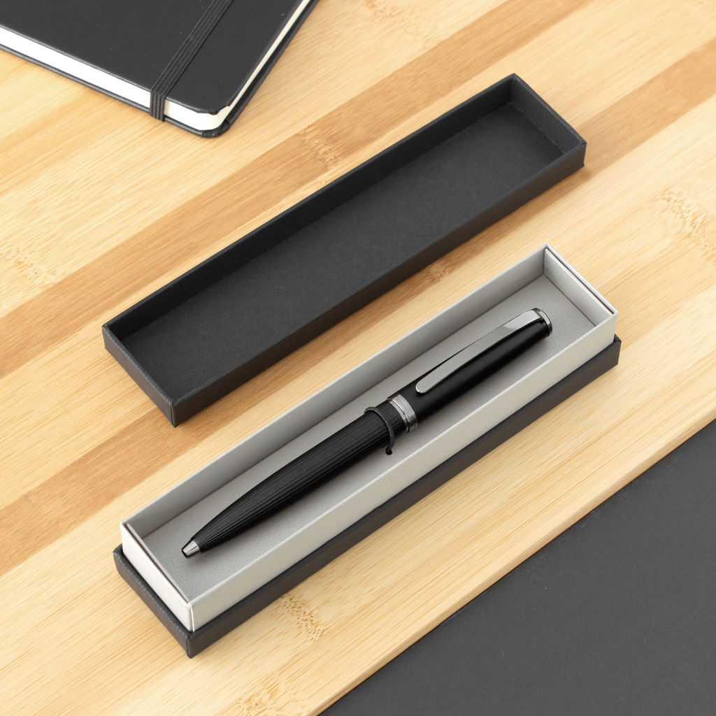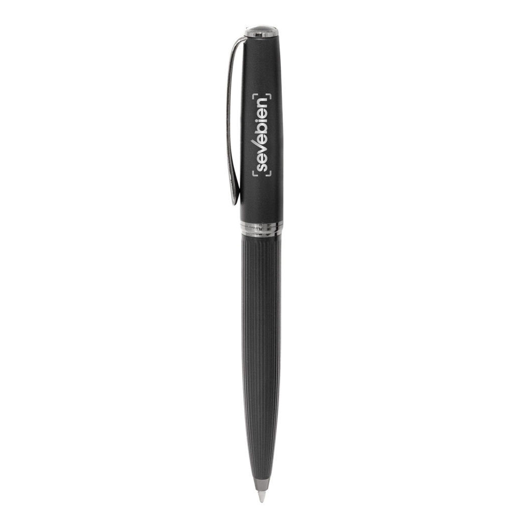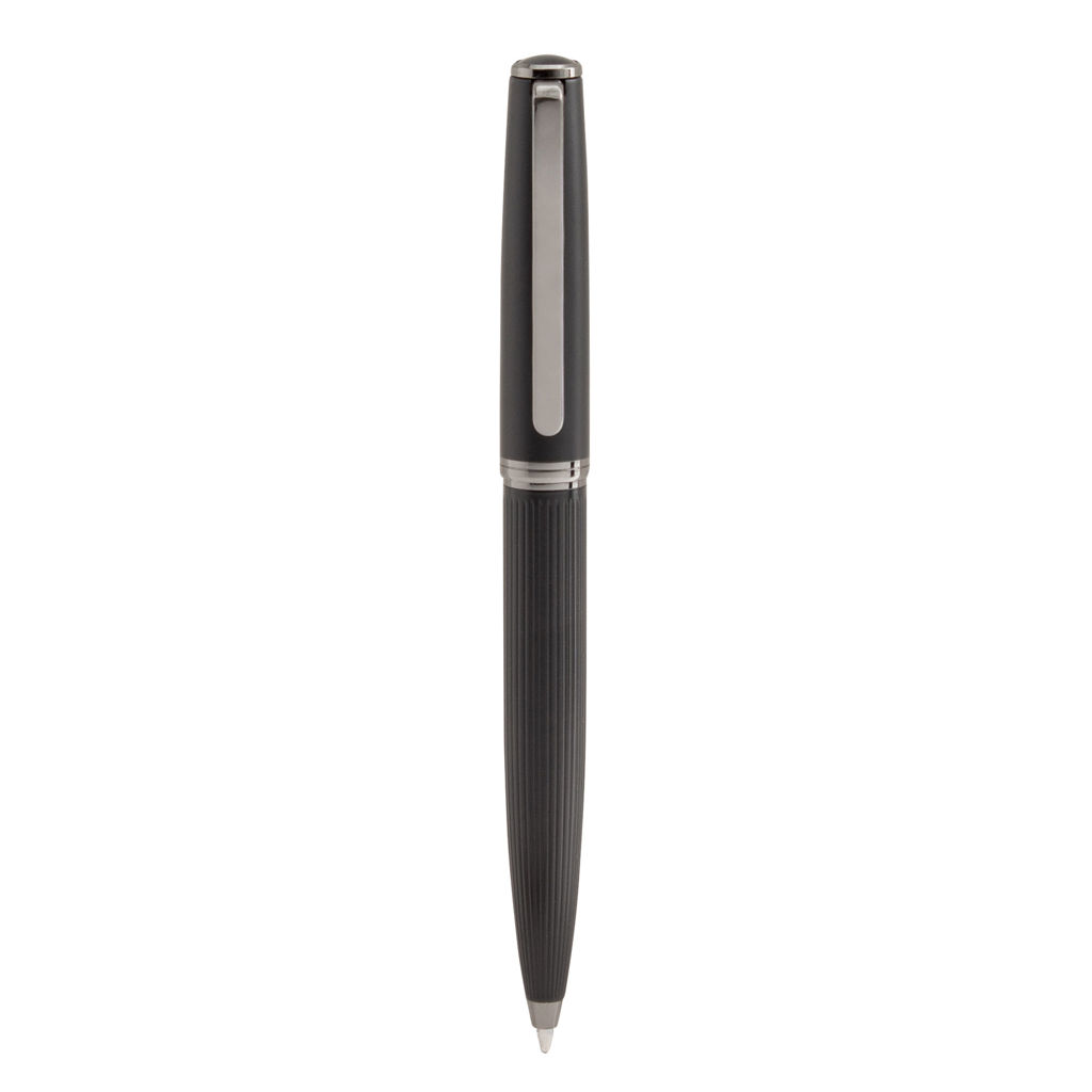 Distinguido y funcional.Bolígrafo con apertura giratoria. Cuerpo color negro mate. Puntera, clip y anillo metálico color gris gun. En la parte superior destape electroplateado. Parte inferior texturada para mejor agarre. Recarga metálica.