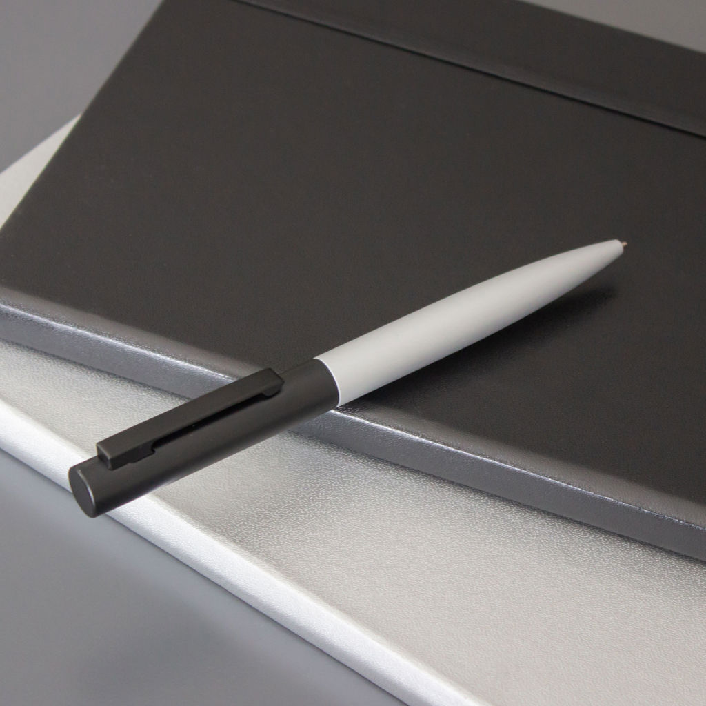 Metal. Cuerpo metálico plata mate. En la parte superior color negro con clip del mismo color. Apertura giratoria. Tinta negra.