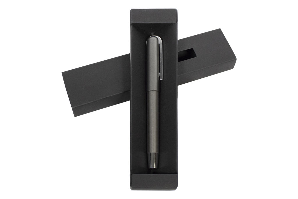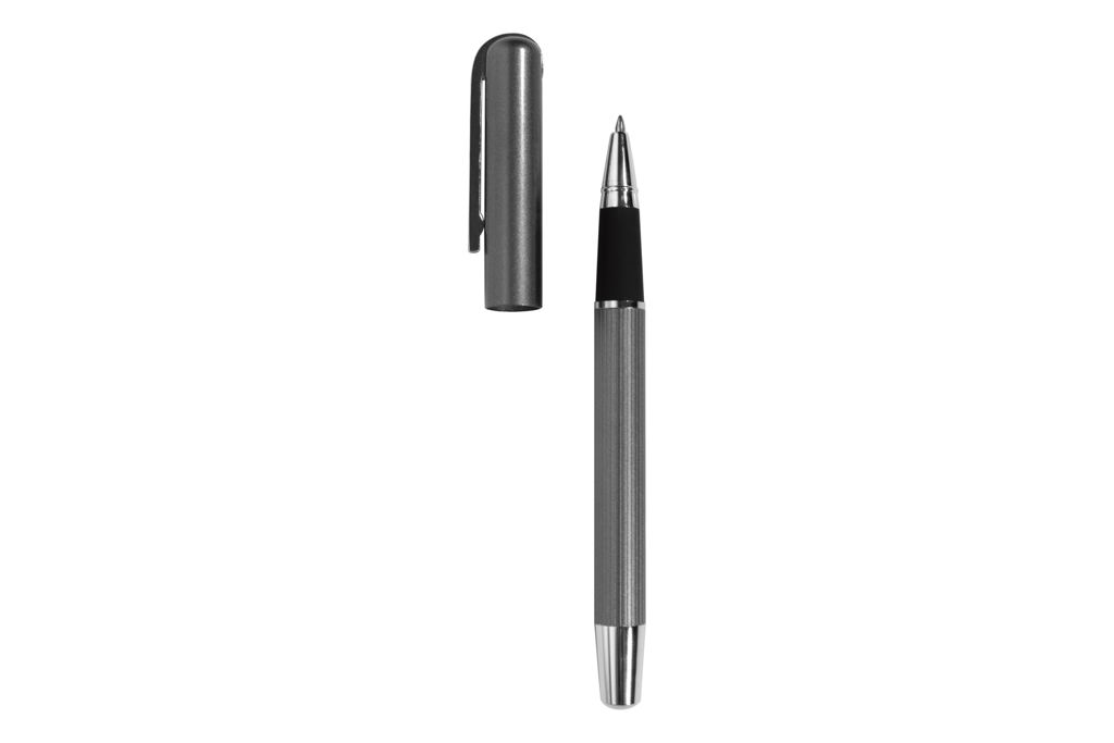 Metal. Cuerpo color plata con detalles, capuchon con clip plata brillante. Tinta gel color negra. Decape color plata. Presentación en caja de regalo.