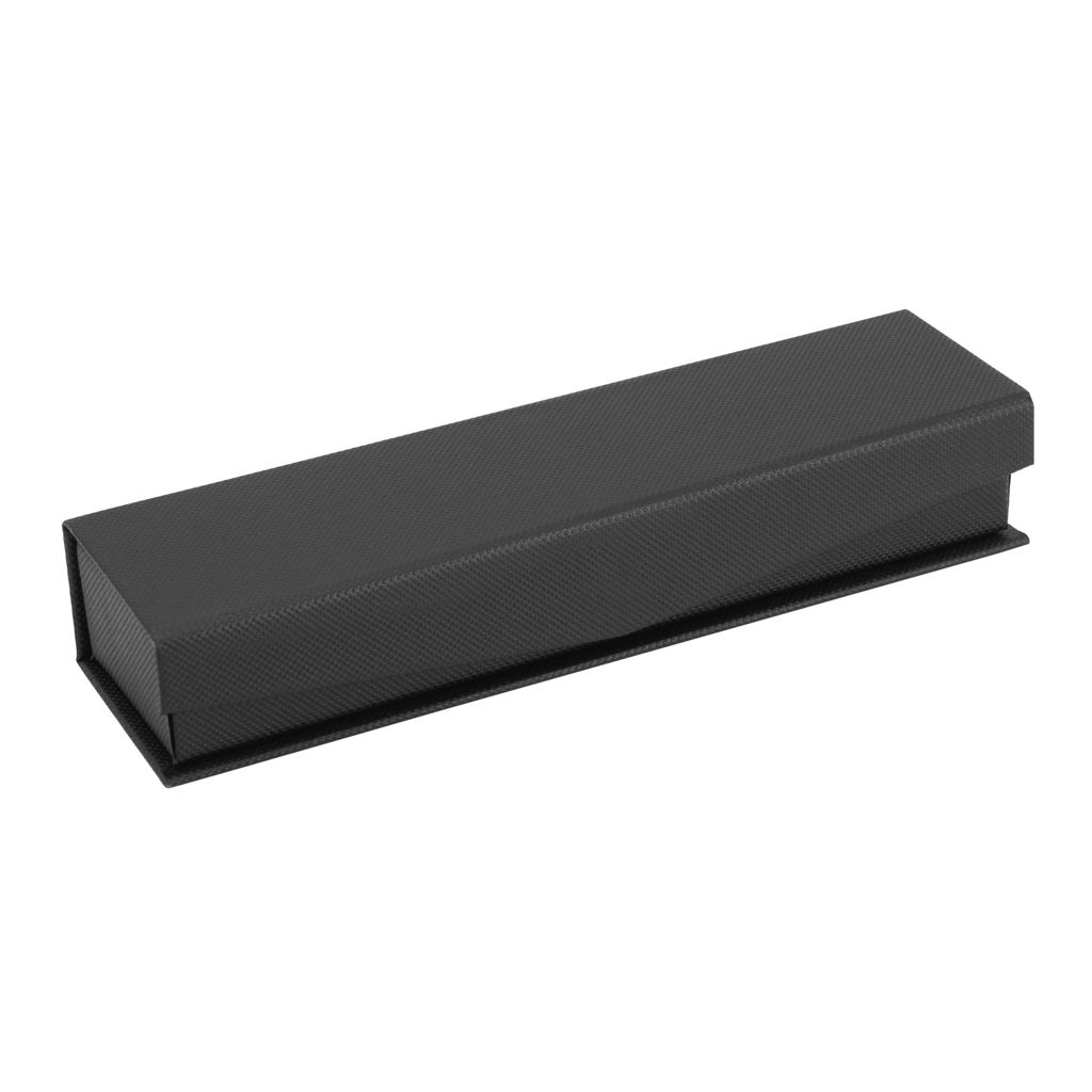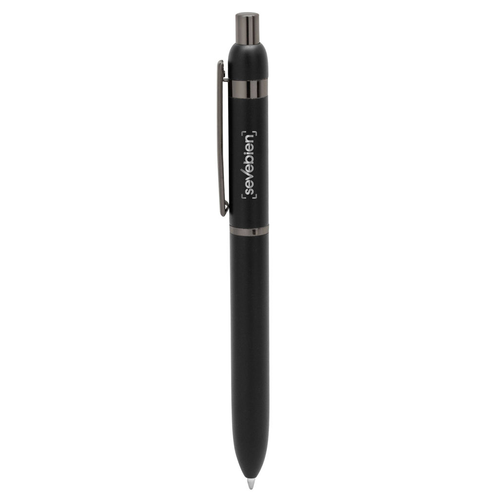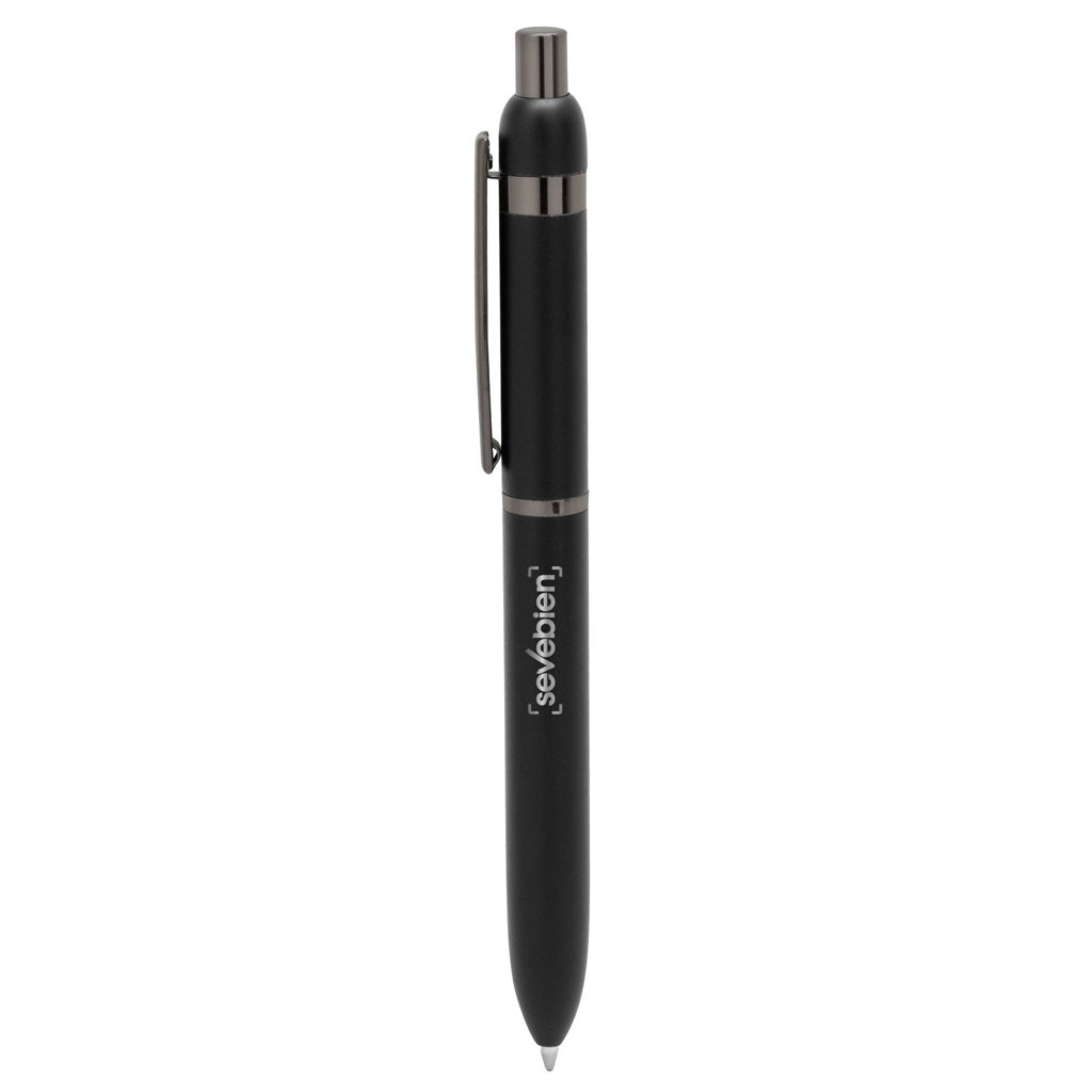 Metal. Cuerpo de aluminio. Bolígrafo retráctil. Clip, botón y anillos metálicos color plata oscuro. Tinta Negra. Destape electroplateado en ambas partes. Presentación en estuche con cierre magnético.
