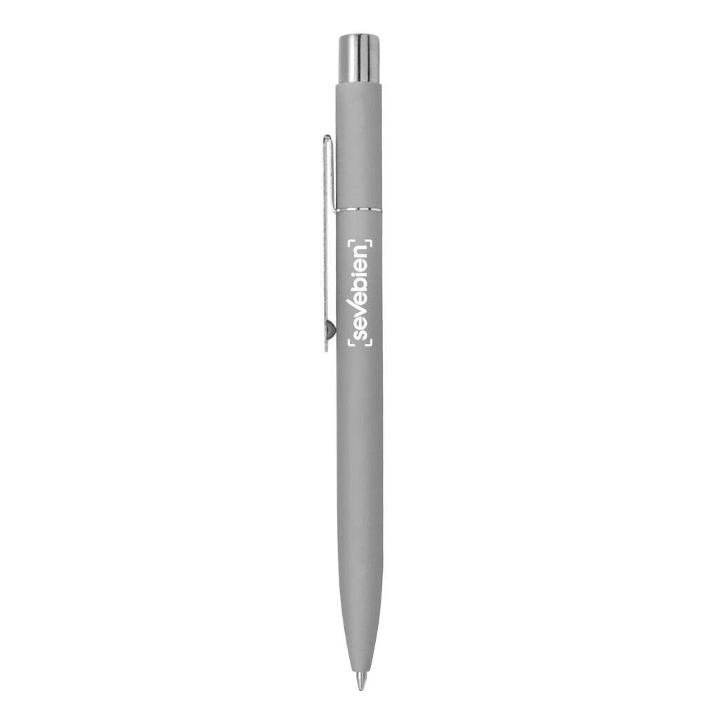 Metal. Cuerpo de aluminio, acabado engomado en diferentes colores, muy suave al tacto. Bolígrafo retráctil. Clip, pulsador y anillo metálicos color plata. Tinta negra. Destape al grabar color plata.