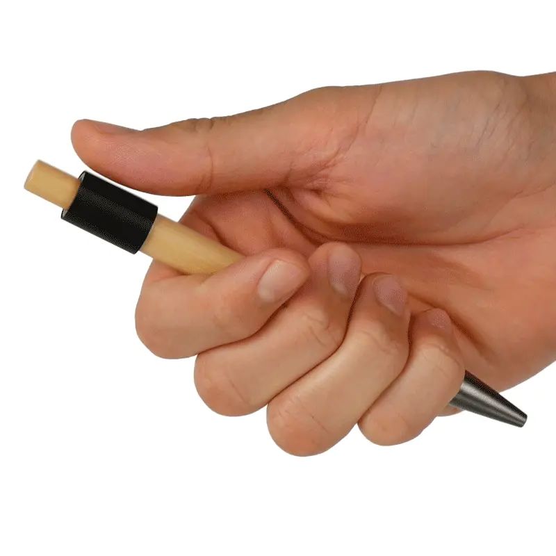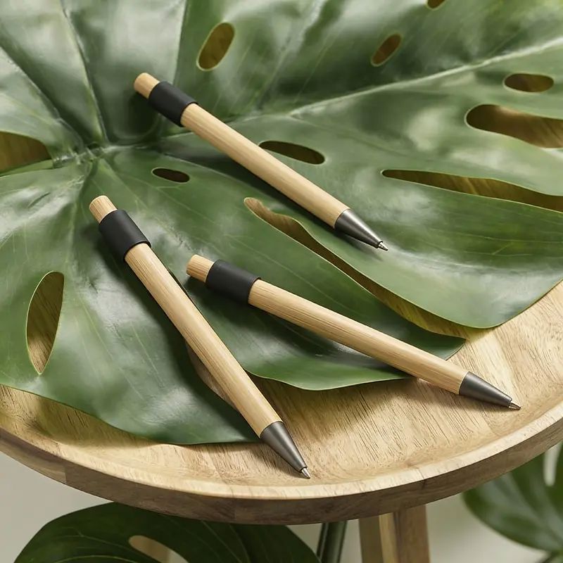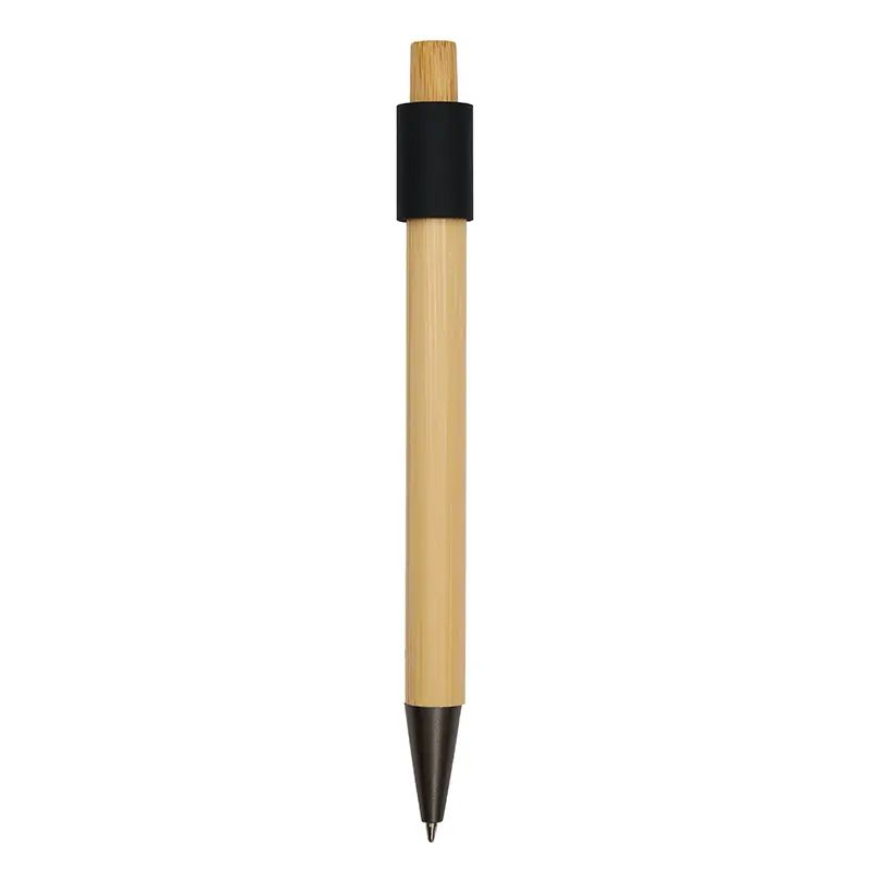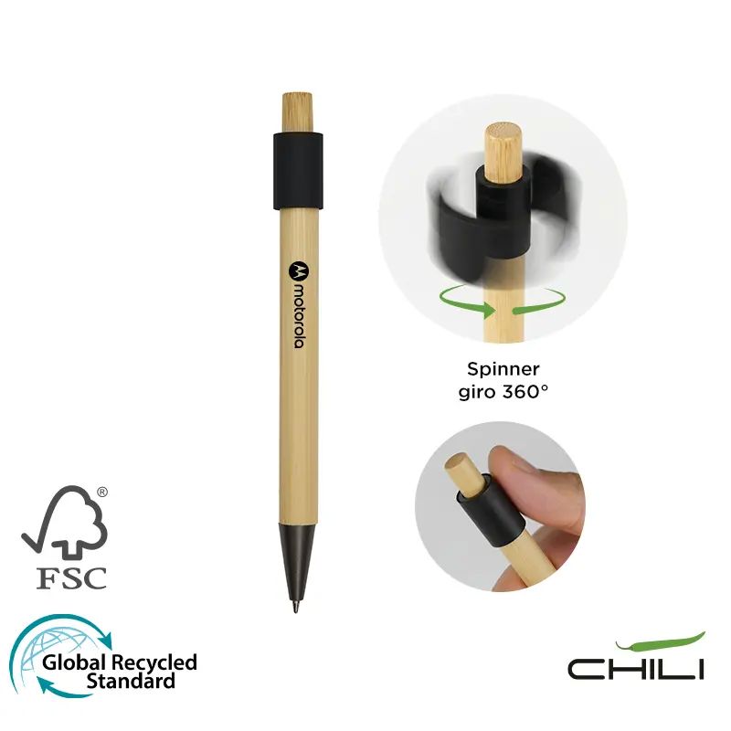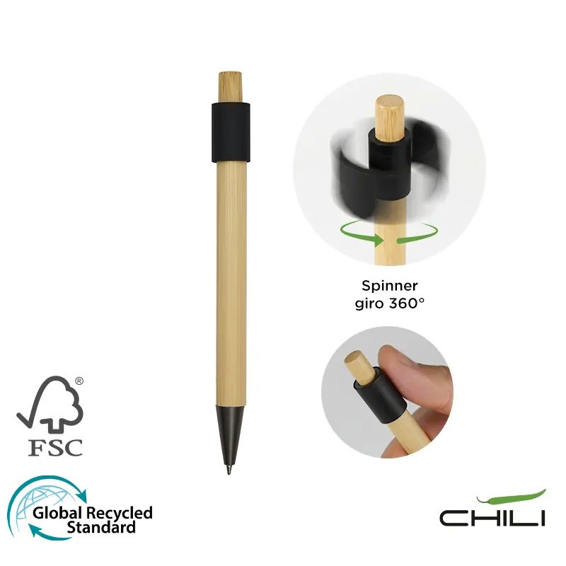 Bolígrafo de bambú y aluminio reciclado. Fabricado con un cuerpo de bambú certificado FSC y detalles de aluminio. Cuenta tinta negra, un diseño sin clip, y una parte superior giratoria, el rodamiento de bolas de alta calidad ofrece un giro suave e interminable, lo que lo convierte en un calmante para el estrés. Es ideal para quienes buscan un bolígrafo funcional y ecológico que también actúe como antiestrés, iniciador de conversaciones o herramienta de escritura diaria.