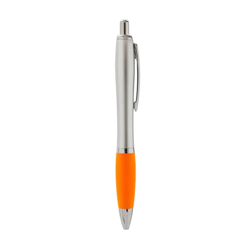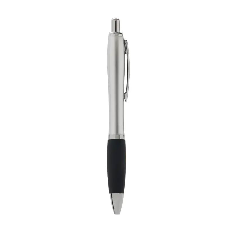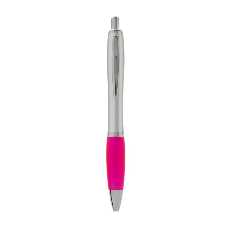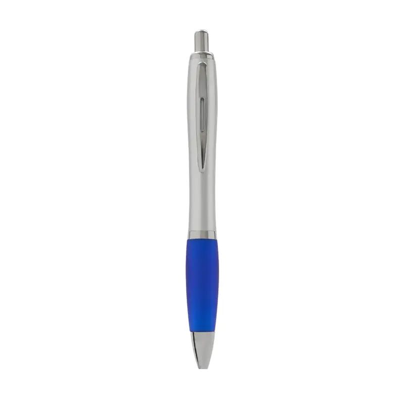 Bolígrafo con cuerpo curvo plástico en acabado plateado. Cuenta con grip de goma de color, clip y botón metálico, mecanismo retráctil y tinta negra.