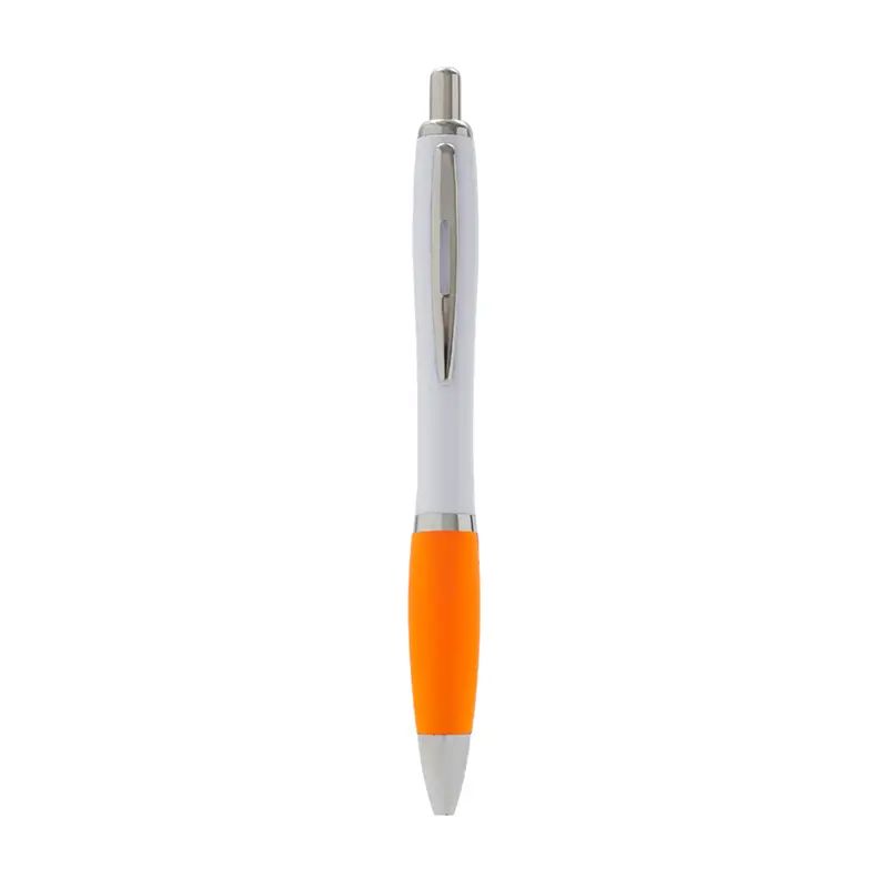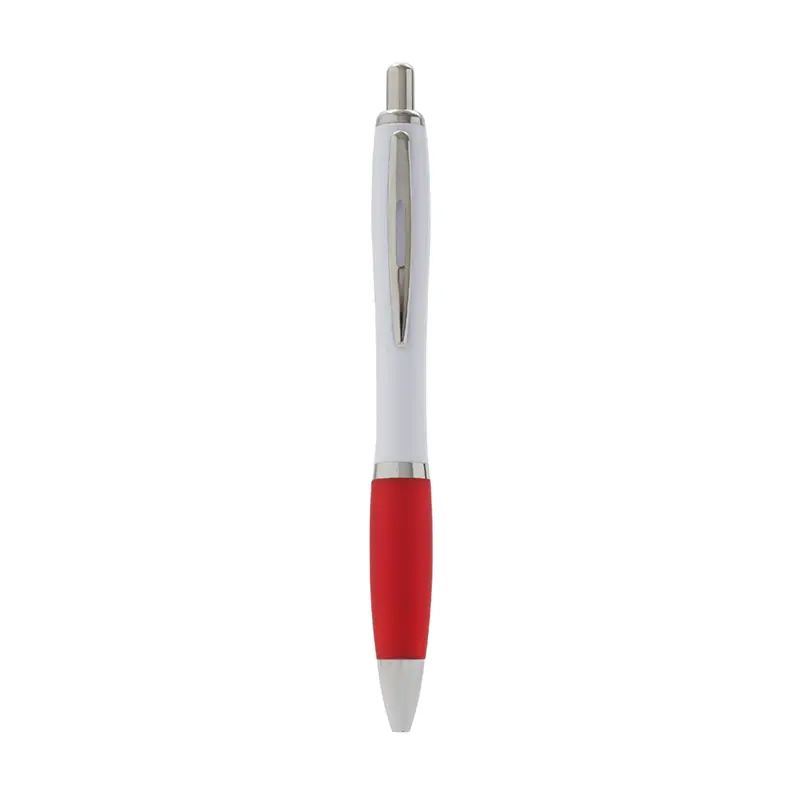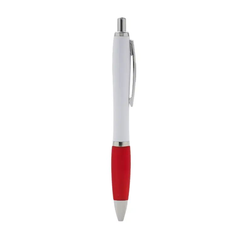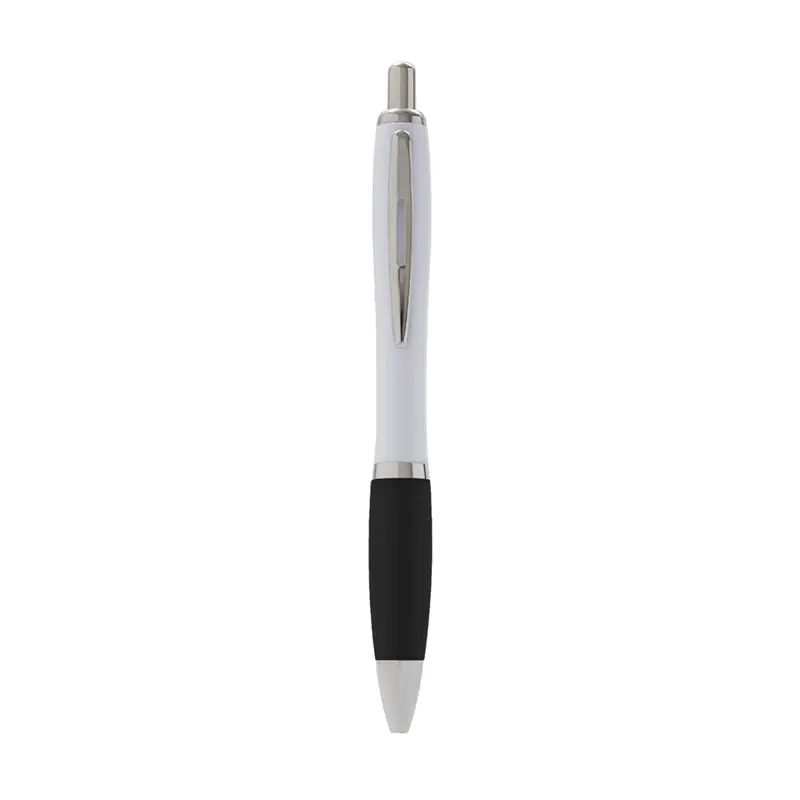 Bolígrafo con cuerpo curvo plástico en acabado blanco. Cuenta con grip de goma de color, clip y botón metálico, mecanismo retráctil y tinta negra.
