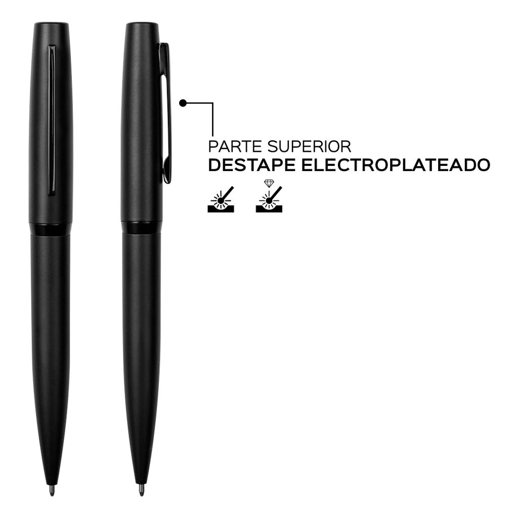 Metálico. Cuerpo color mate. Clip y anillo metálico. En la parte superior destape electroplateado. Apertura giratoria. Tinta negra. Presentación en caja de regalo.