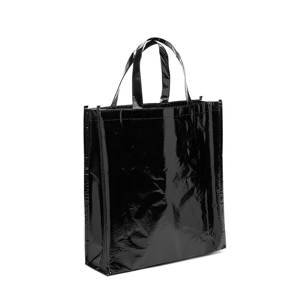 Realizada en Nonwoven Laminated Metallic. Manijas reforzadas. Medidas: 36 x 40 x 10 cm.