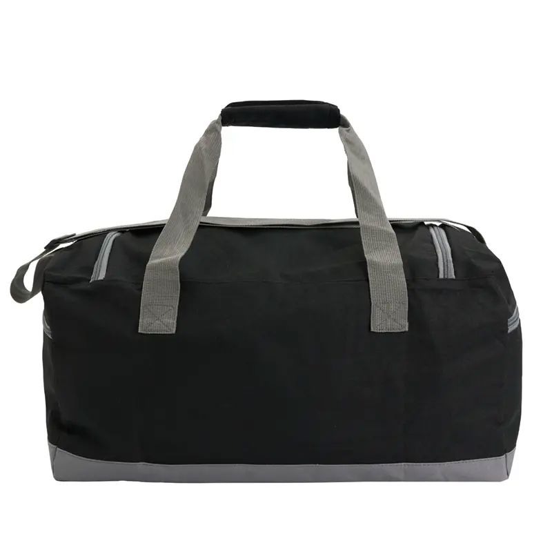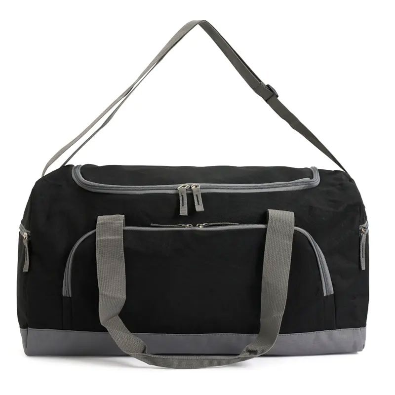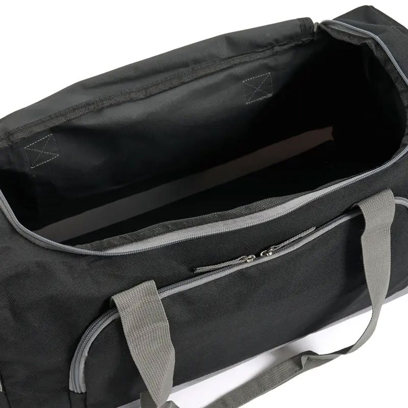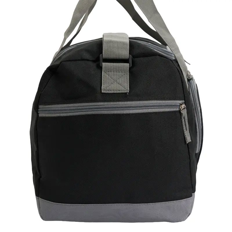 Bolso deportivo con múltiples bolsillos y tiras contrastantes. Confeccionado en tela 600D. Cuenta con compartimiento principal con cierre, bolsillos delanteros y laterales, manijas superiores y correa regulable. Es ideal para entrenamientos, actividades deportivas o escapadas cortas.