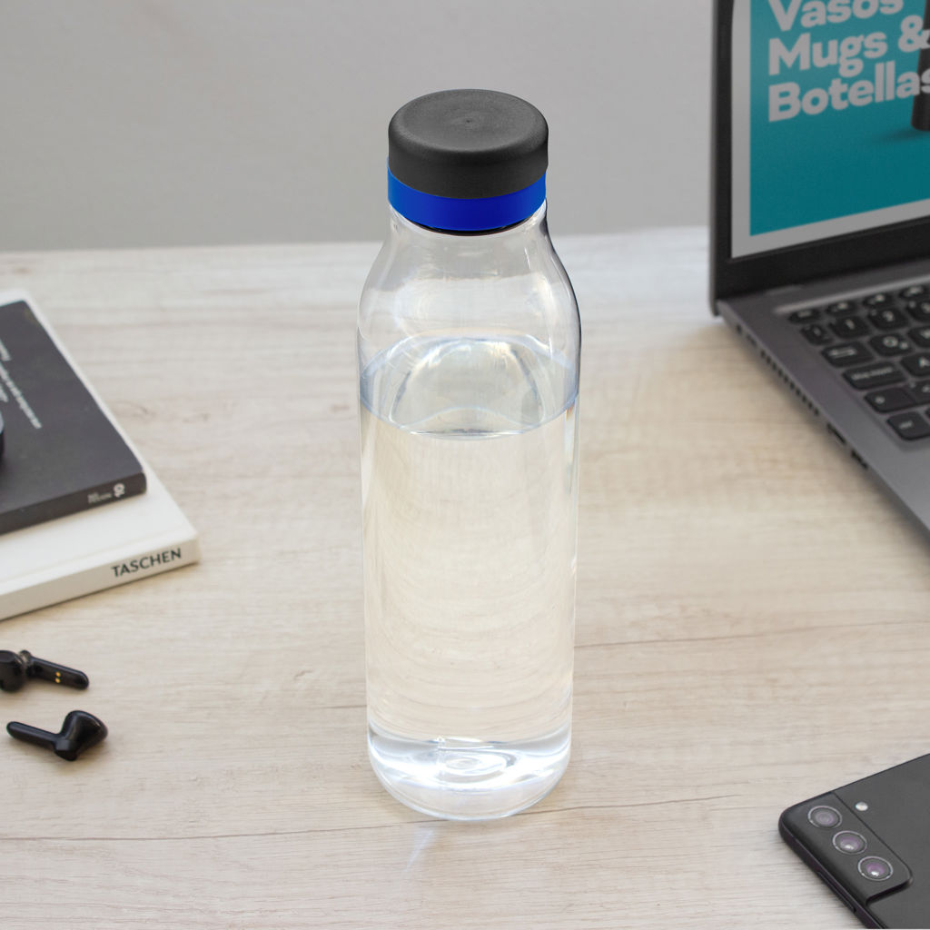 ¡Tu botella, a tu manera!Botella de plástico transparente con tapa a rosca color negro mate con anillo de silicona de diferentes colores.Medidas: Ø 7 x 24,5 cm.