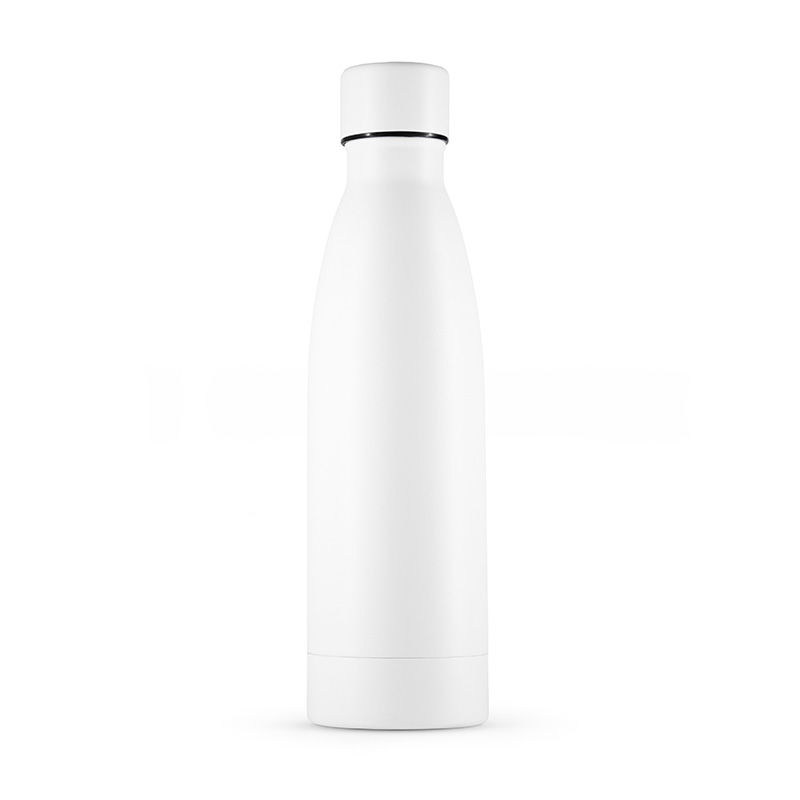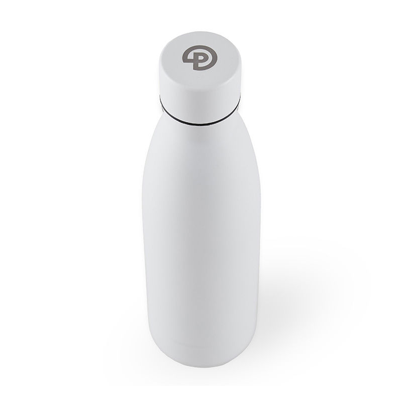 Botella reutilizable de doble pared de acero inoxidable, esmaltado en su exterior con Powder Coating. Es ideal para mantener la temperatura de la bebida: mantiene 4 horas la bebida caliente y 8 horas la bebida fría. Su tapa está confeccionada en PP, acero inoxidable y silicona para evitar derrames de líquido. Capacidad: 500 ml.