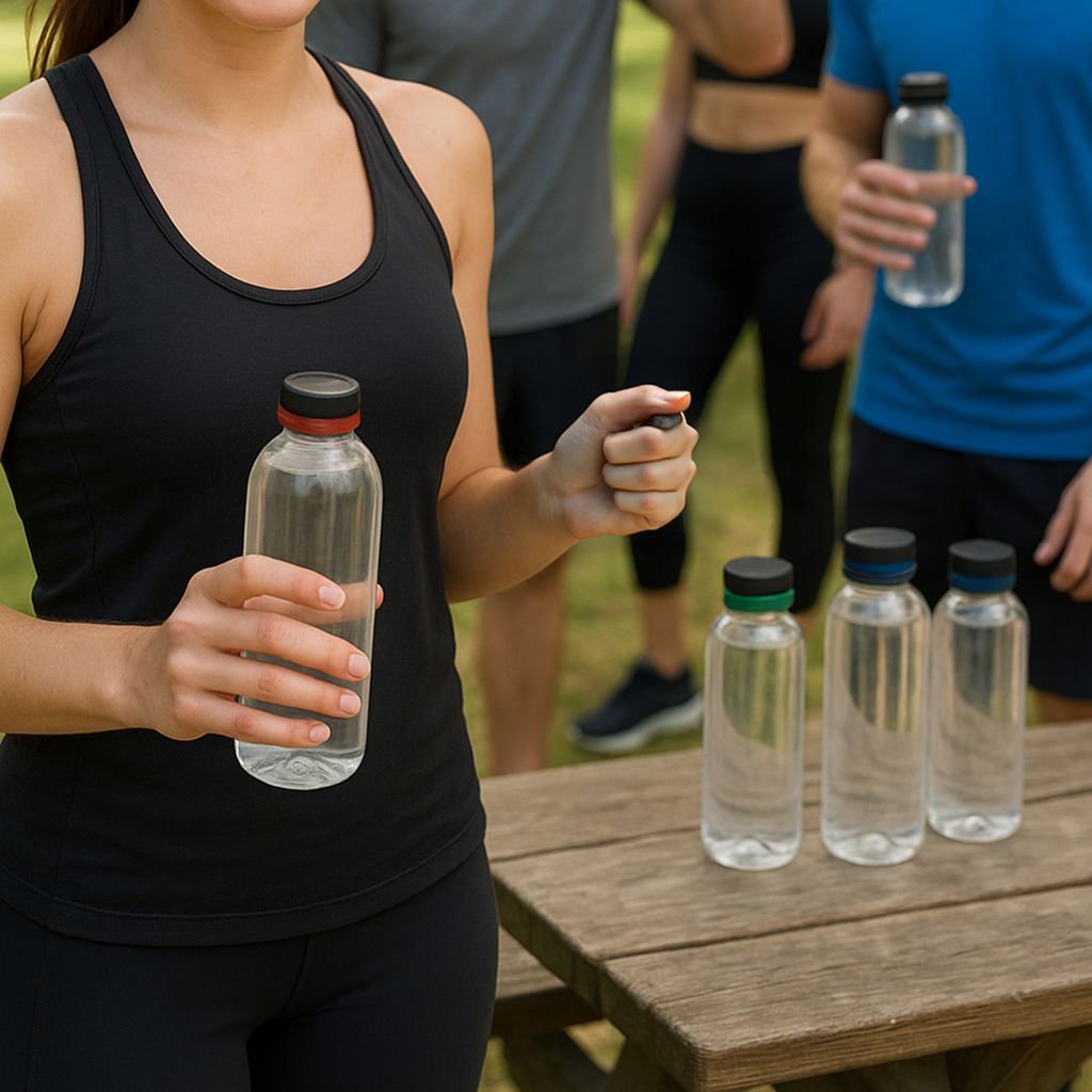 Translúcida y moderna. Botella de plástico transparente con tapa a rosca color negro mate con anillo de silicona de diferentes colores.Medidas: Ø 7 x 23 cm.