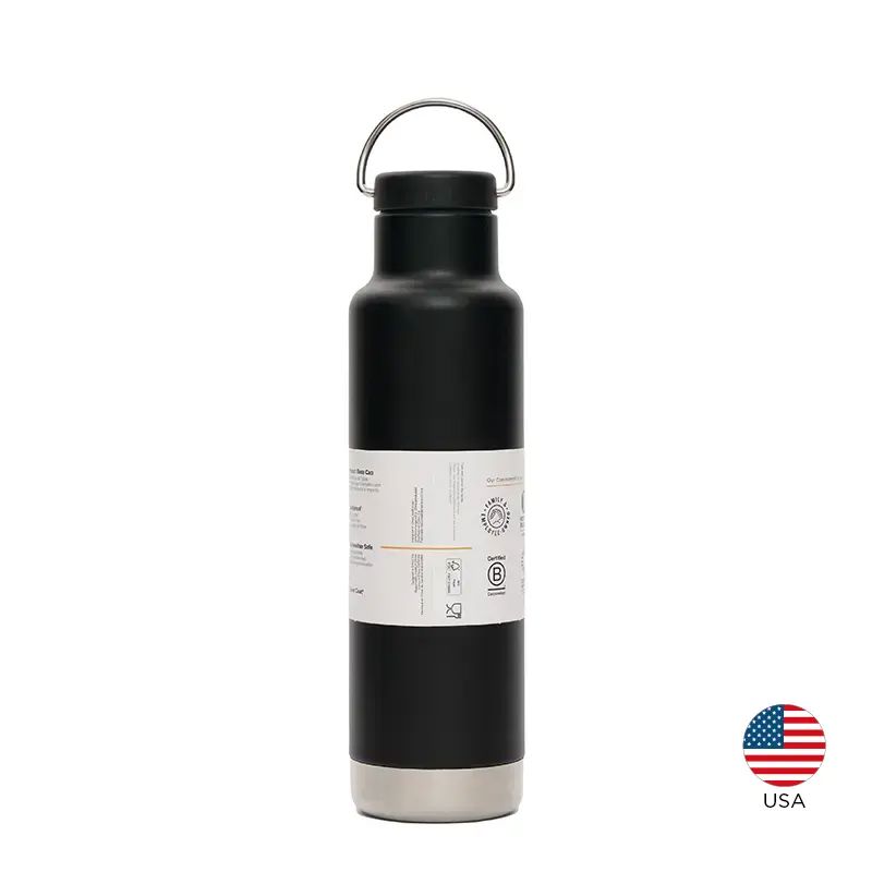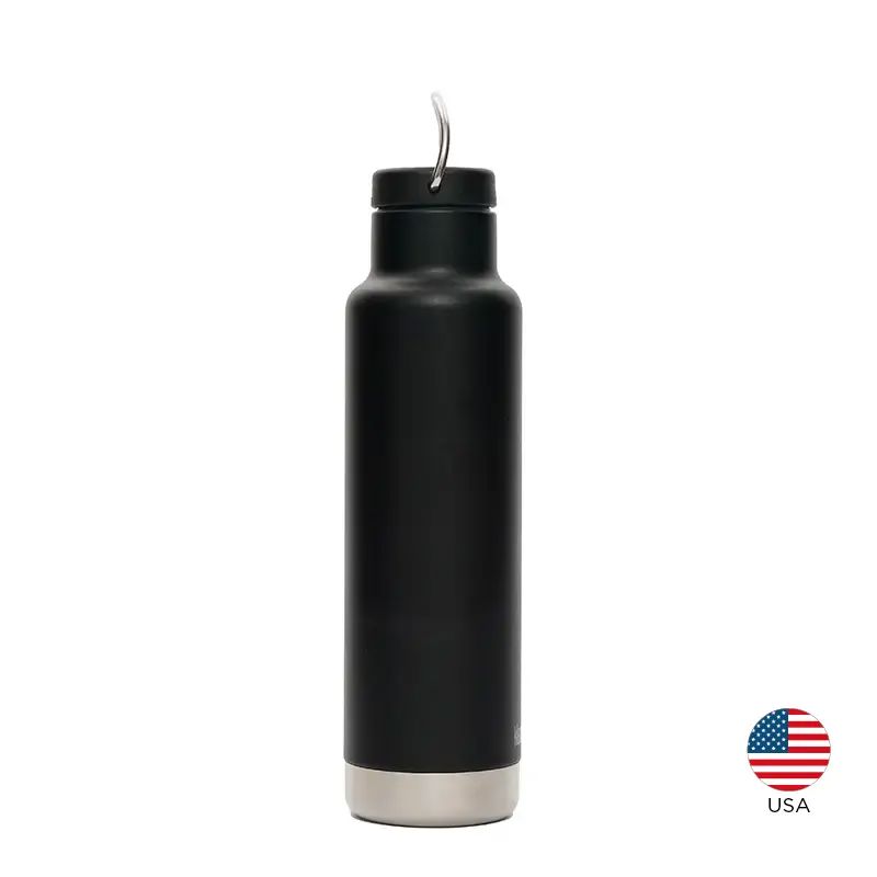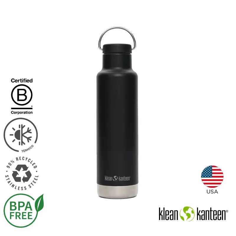Botella térmica de 592 ml fabricada en doble pared de acero inoxidable, manteniendo las bebidas calientes durante 24 horas y frías durante 63 horas. Exterior en polvo Klean Coat, resistente a las astillas, es duradero y seguro para las personas y el planeta. Cuenta con tapa a rosca y gancho de agarre.
