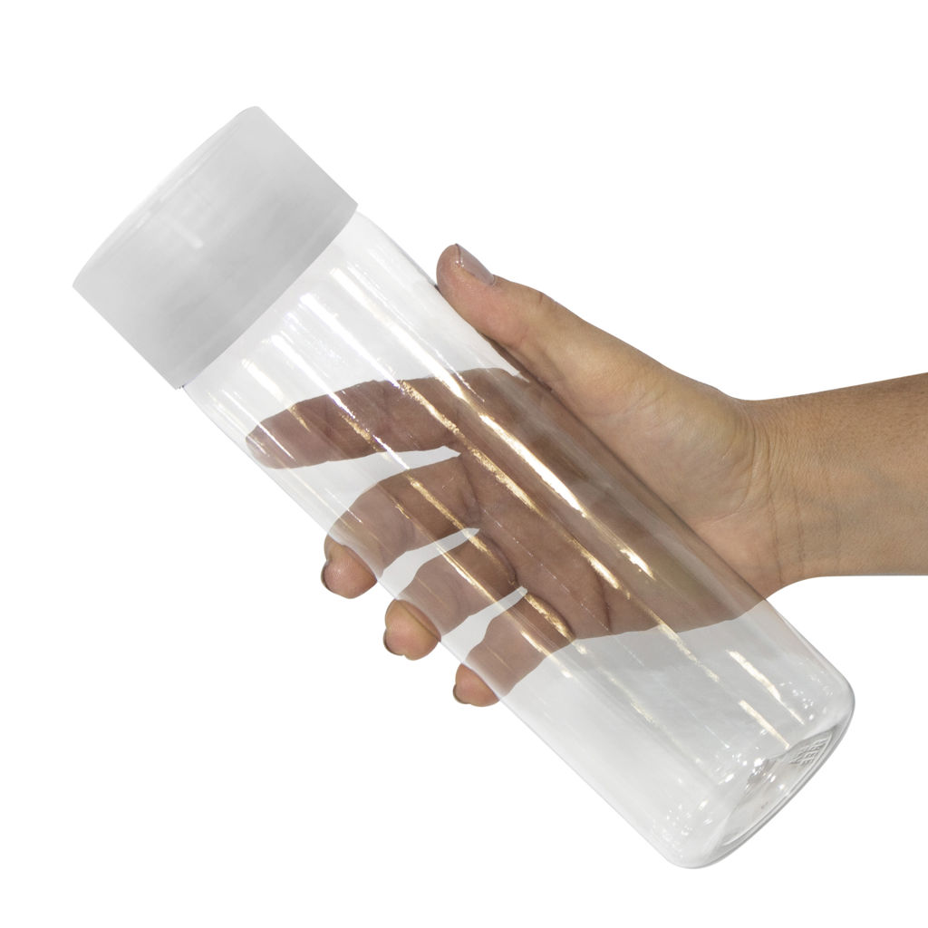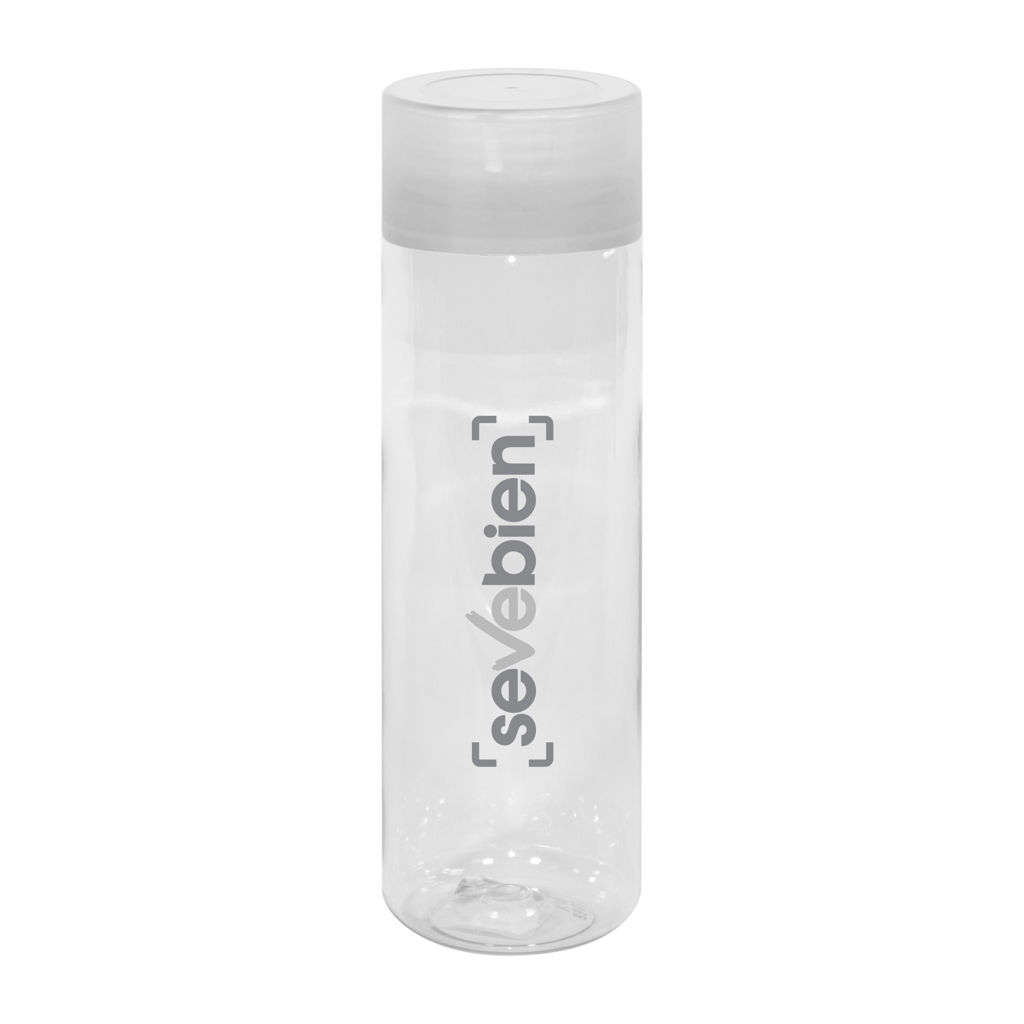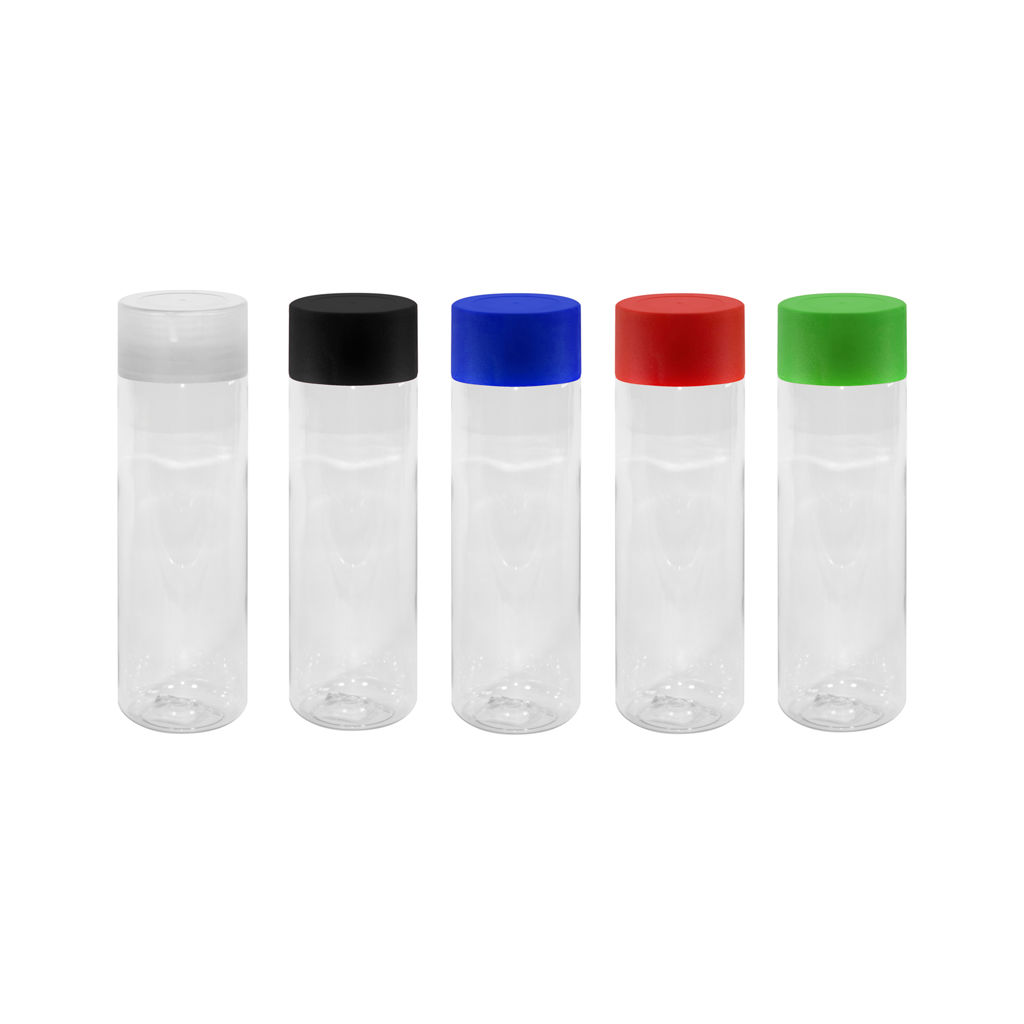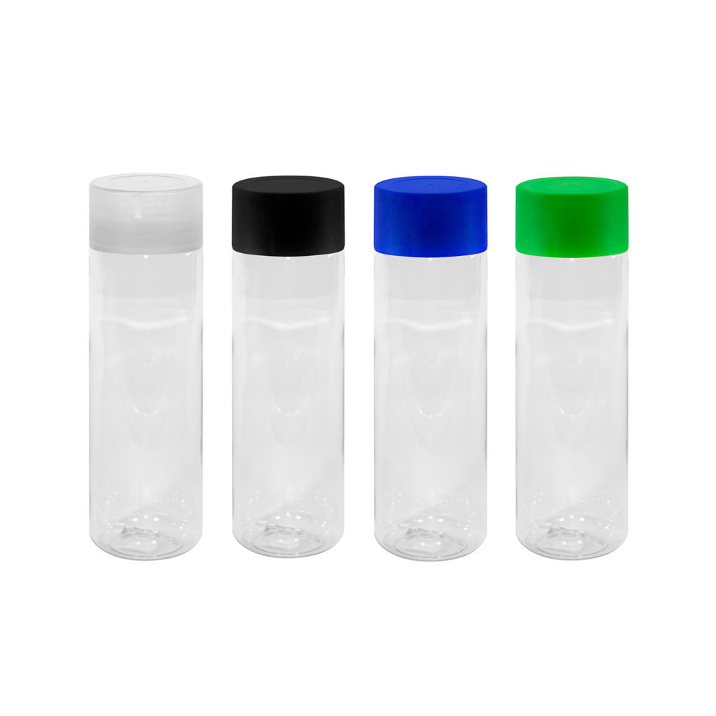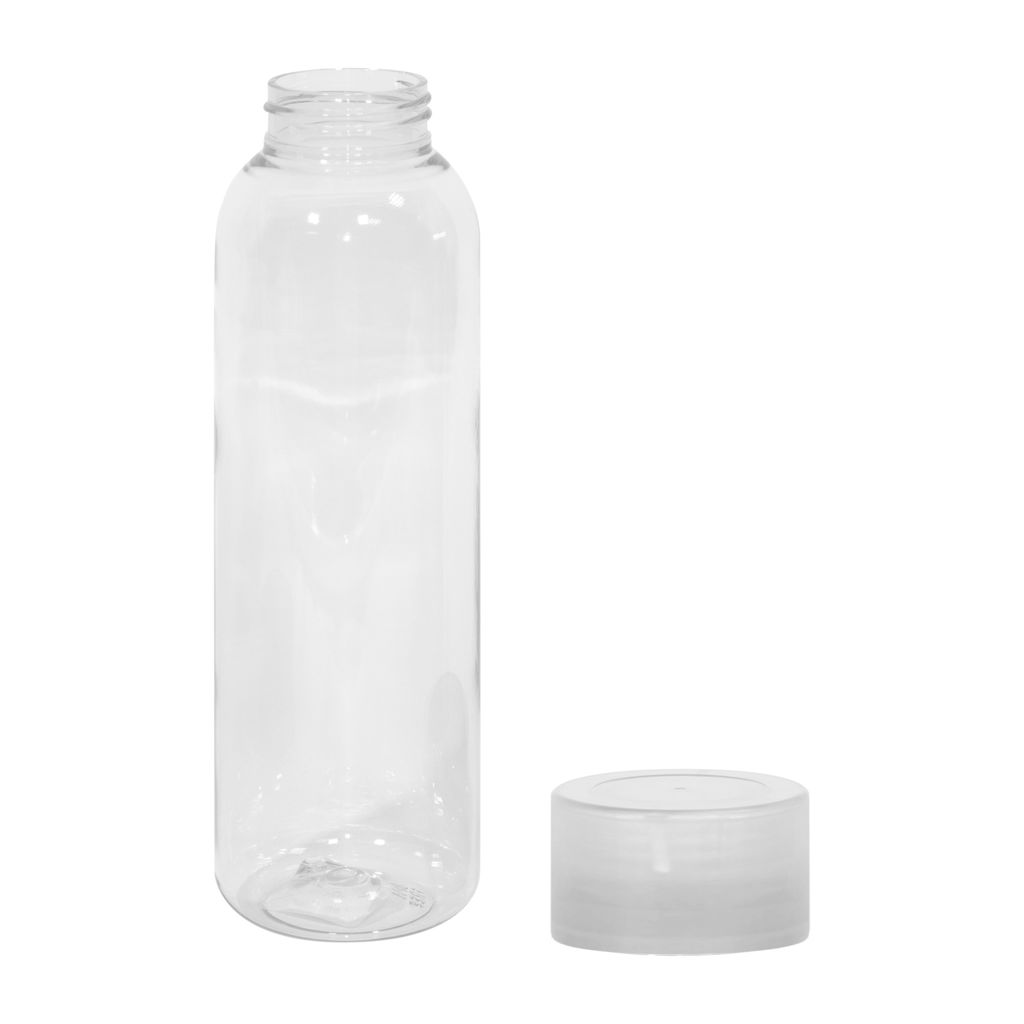 Botella de plástico transparente con tapa a rosca plástica.