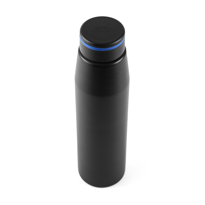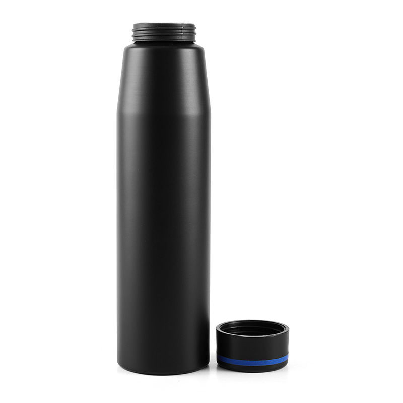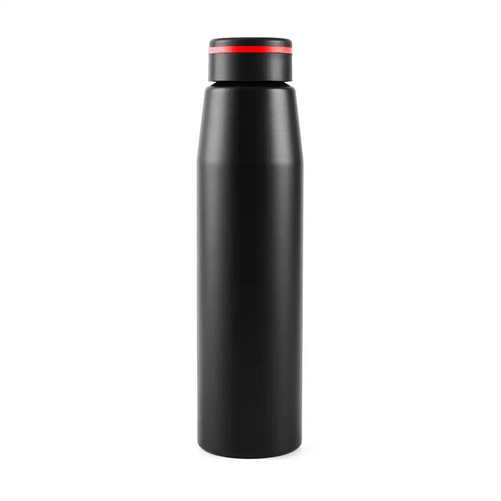 Botella de 700 ml fabricada en aluminio con tapa negra a rosca con banda de silicona de color gris, roja o azul. Ideal para tus actividades deportivas y al aire libre.