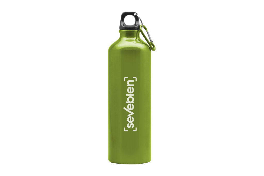 Ø 7,2 x 25,5 cm. Capacidad 750 ml. Aluminio. Botella de aluminio. Tapa a rosca plástica y gancho metálico.