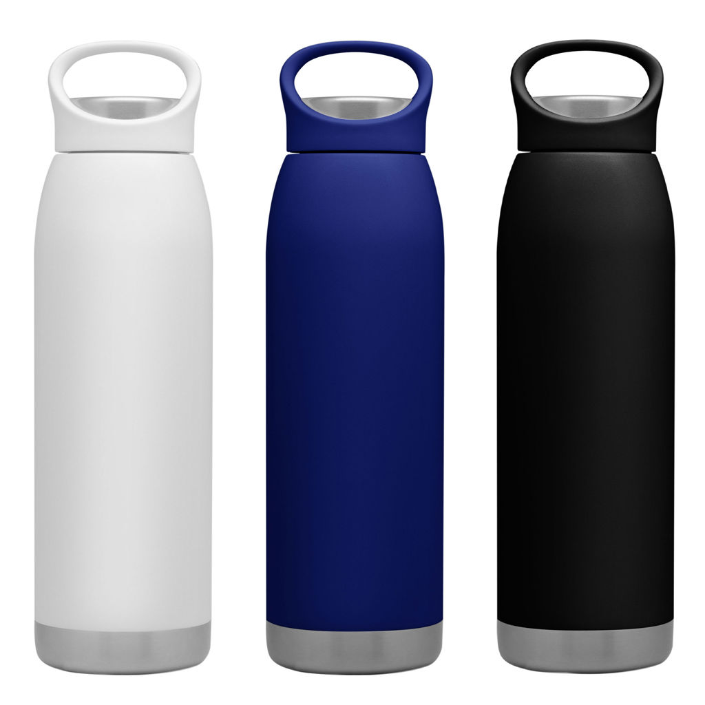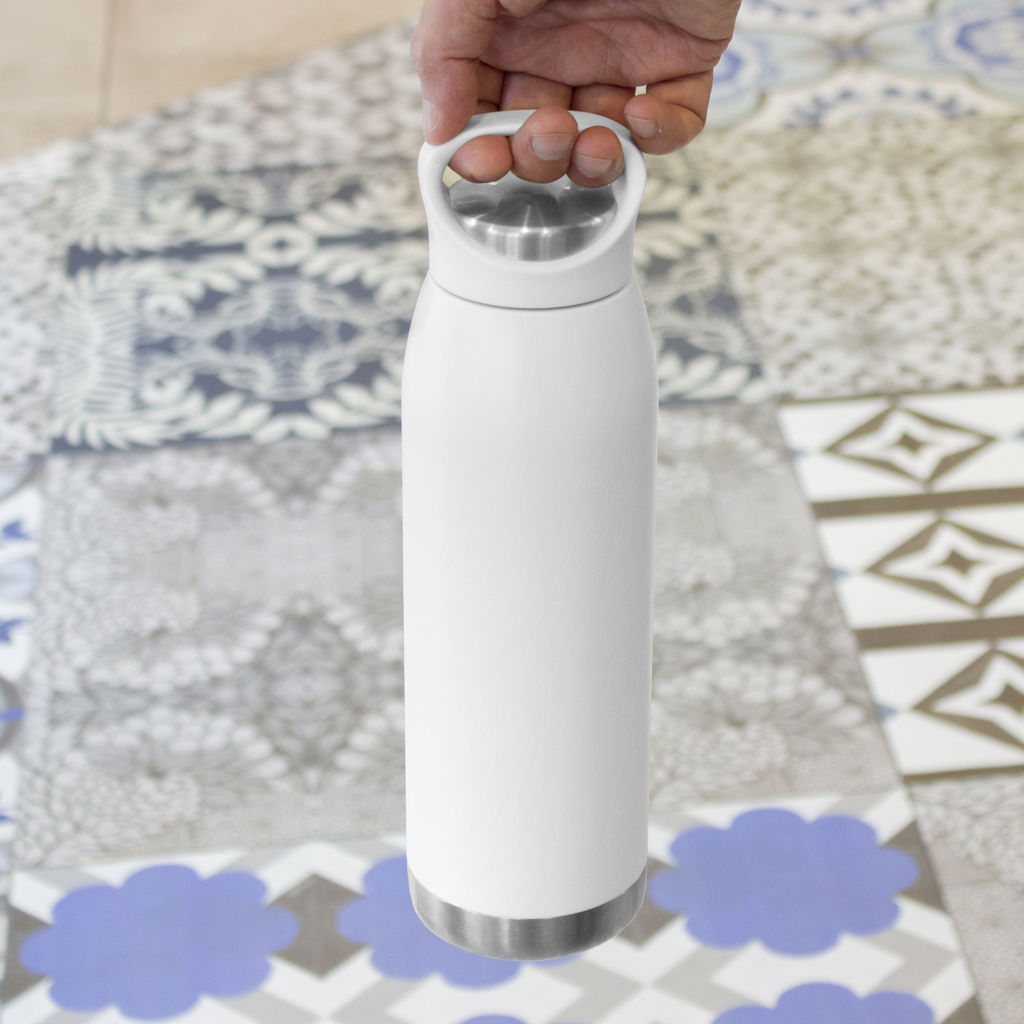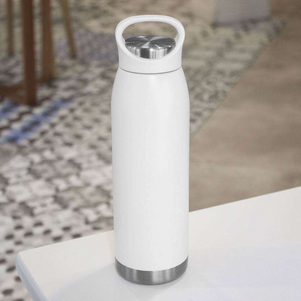 Ø 7,6 x 26,5 cm. Capacidad 600 ml. Acero inoxidable. Botella doble pared, sellada al vacío. Botella con aislamiento térmico. Tecnología vacuum. Interior en acero 304 y exterior en acero 201. Pintura en colores mate. Tapa combinada en plástico del mismo color de la botella y acero inoxidable 201. Mantiene hasta 12 hs la temperatura de las bebidas calientes y hasta 24 hs la de las bebidas frías. Presentación en caja de regalo.