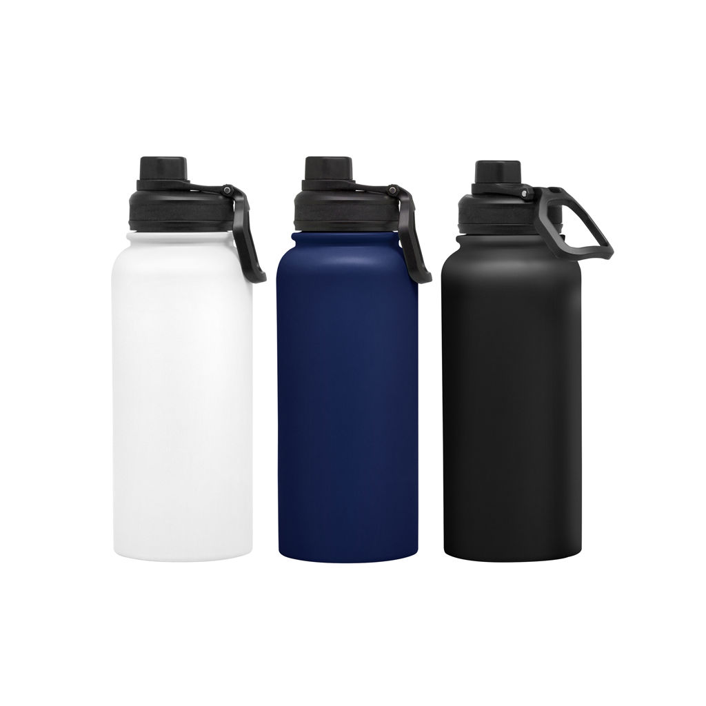Ø 9 x 26 cm. Capacidad 1000 ml. Acero inoxidable. Botella deportiva doble pared, sellada al vacío. Interior en acero 304, exterior en acero 201. Tapa con anillo de silicona, boquilla con cierre a rosca antiderrame y manija plástica para su agarre. Mantiene hasta 12 hs la temperatura de las bebidas calientes y hasta 24 hs la de las bebidas frías. Presentación en caja de regalo.