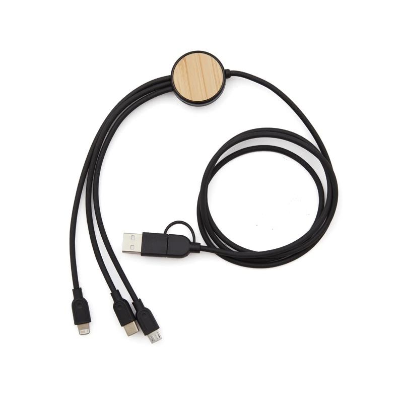 Cable 3 en 1 color negro. Es el accesorio perfecto para mantener tus dispositivos siempre cargados y listos para usar. Cuenta con un cable de entrada tipo C con adaptador USB A y 3 cables de salida TIPO C / MICRO B / LIGHTING, lo que te permite cargar dispositivos con diferentes tipos de entradas. También, cuenta con un accesorio redondo de bamboo de donde salen los 3 cables.