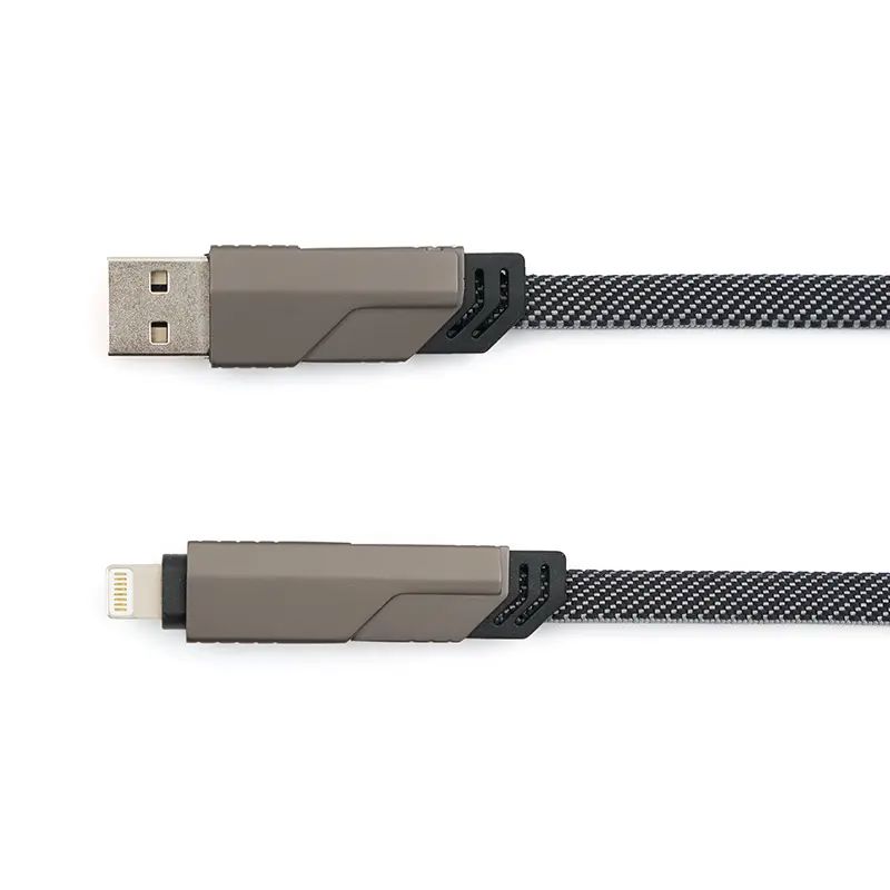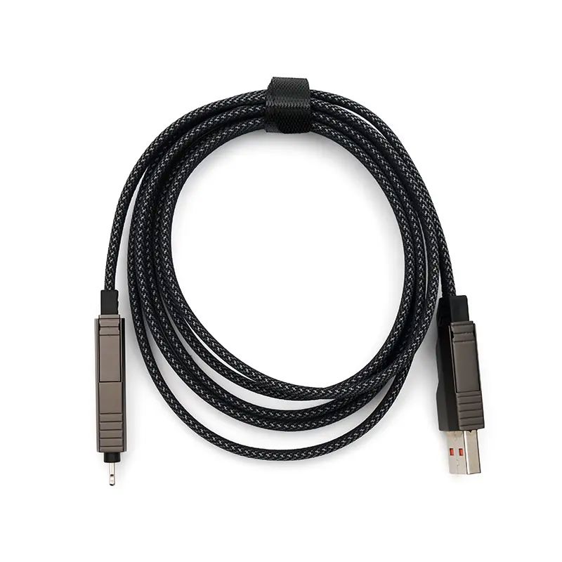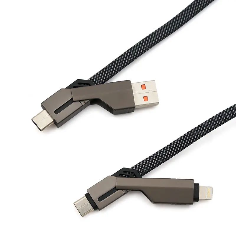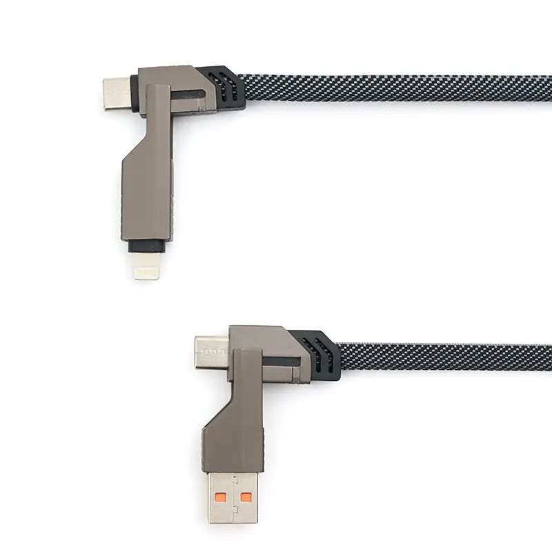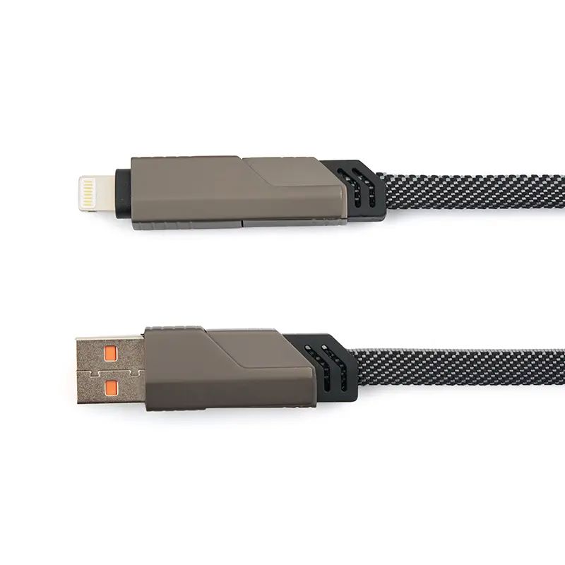 Cable universal de carga 4 en 1 fabricado en PET reciclado. Hecho de materiales sostenibles como RPET con terminaciones en titanio metálico, cuenta con conectores USB-A, USB-C, Lightning y USB-C en ambos extremos, además de correa de nailon para facilitar su organización. Es ideal para cargar una amplia variedad de dispositivos como smartphones, tablets y otros equipos electrónicos, garantizando eficiencia energética y alta velocidad gracias a su capacidad de carga de hasta 60 W y transferencia de datos de hasta 480 Mbps.