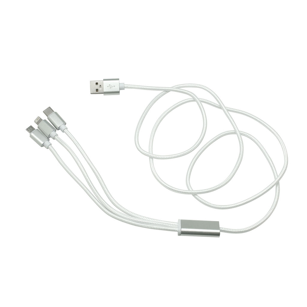 Aluminio y Nylon. 120 cm. Cable con entrada USB y diferentes adaptadores: Iphone, Type C y Android. Viene dentro de una bolsa plásticas con cierre ziploc. Carga rápida de 2,1 a.