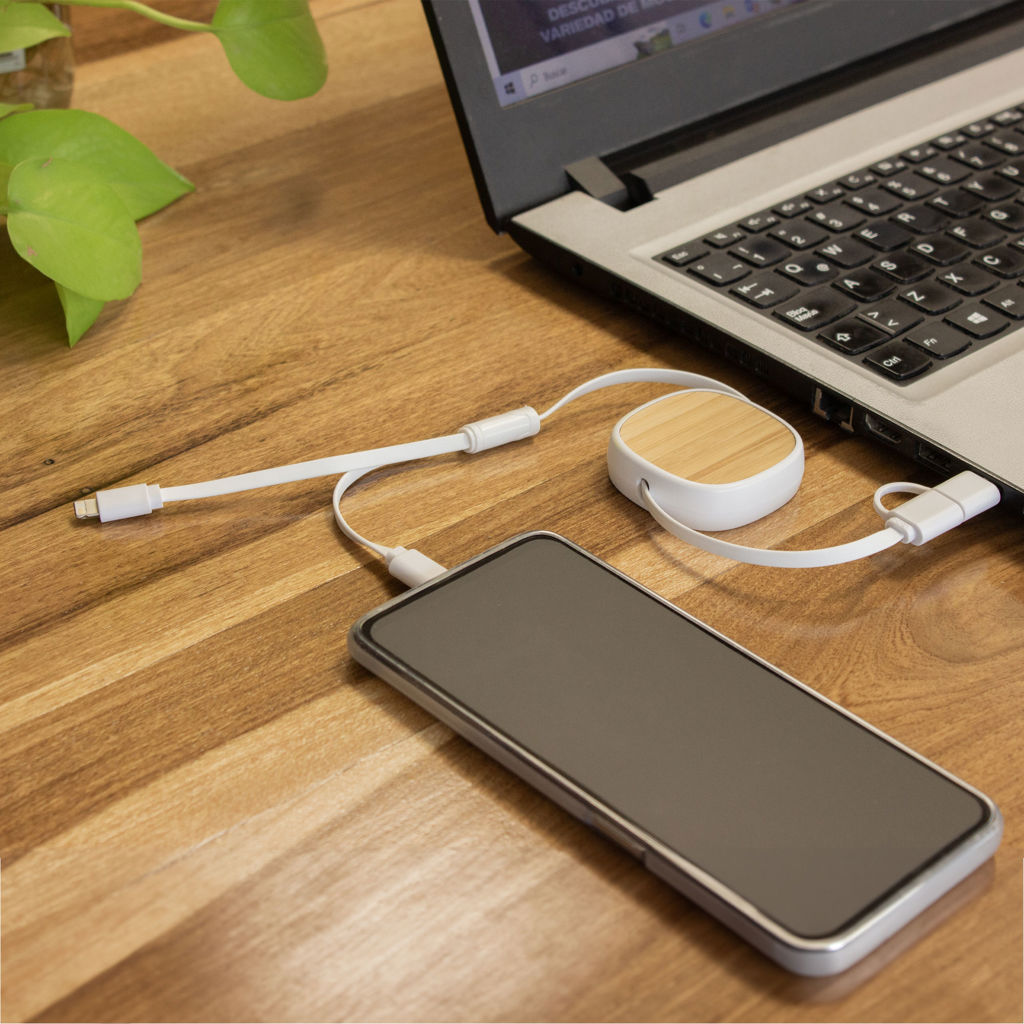 Cable de carga retráctil color blanco con panel frontal en bambú. Posee un conector Lightning, dos conectores USB-C y un conector USB standard.