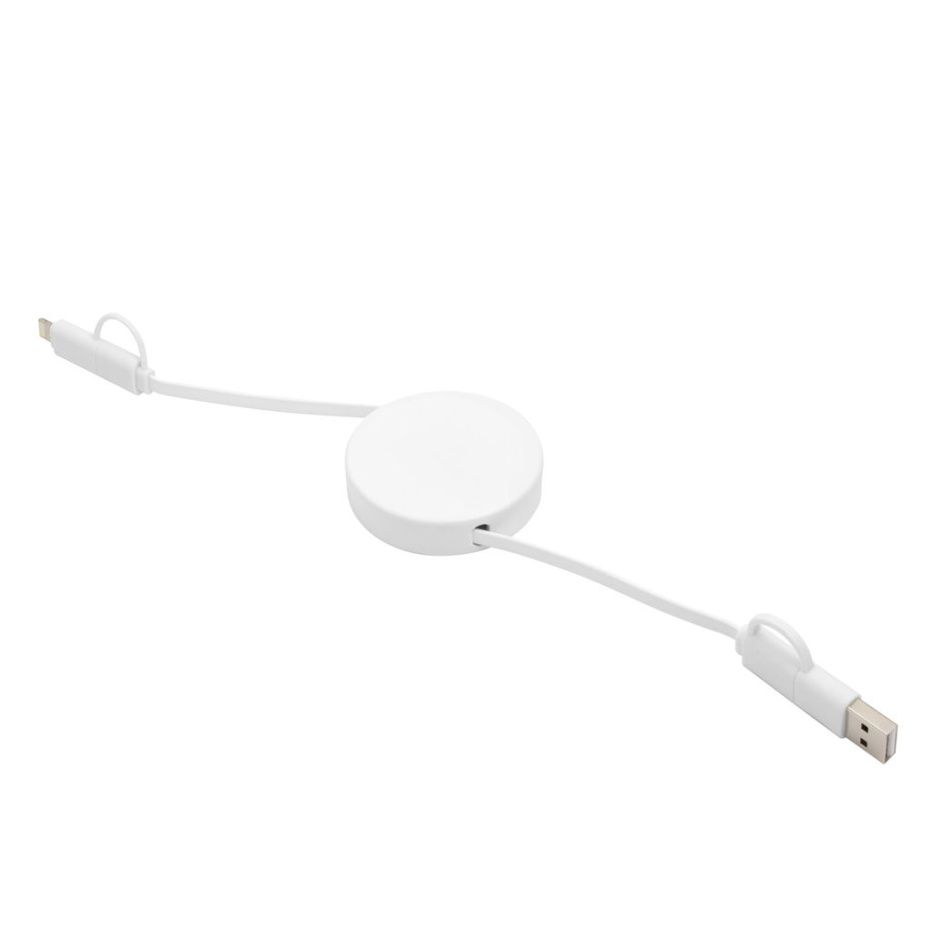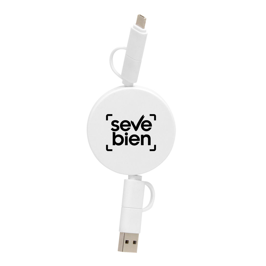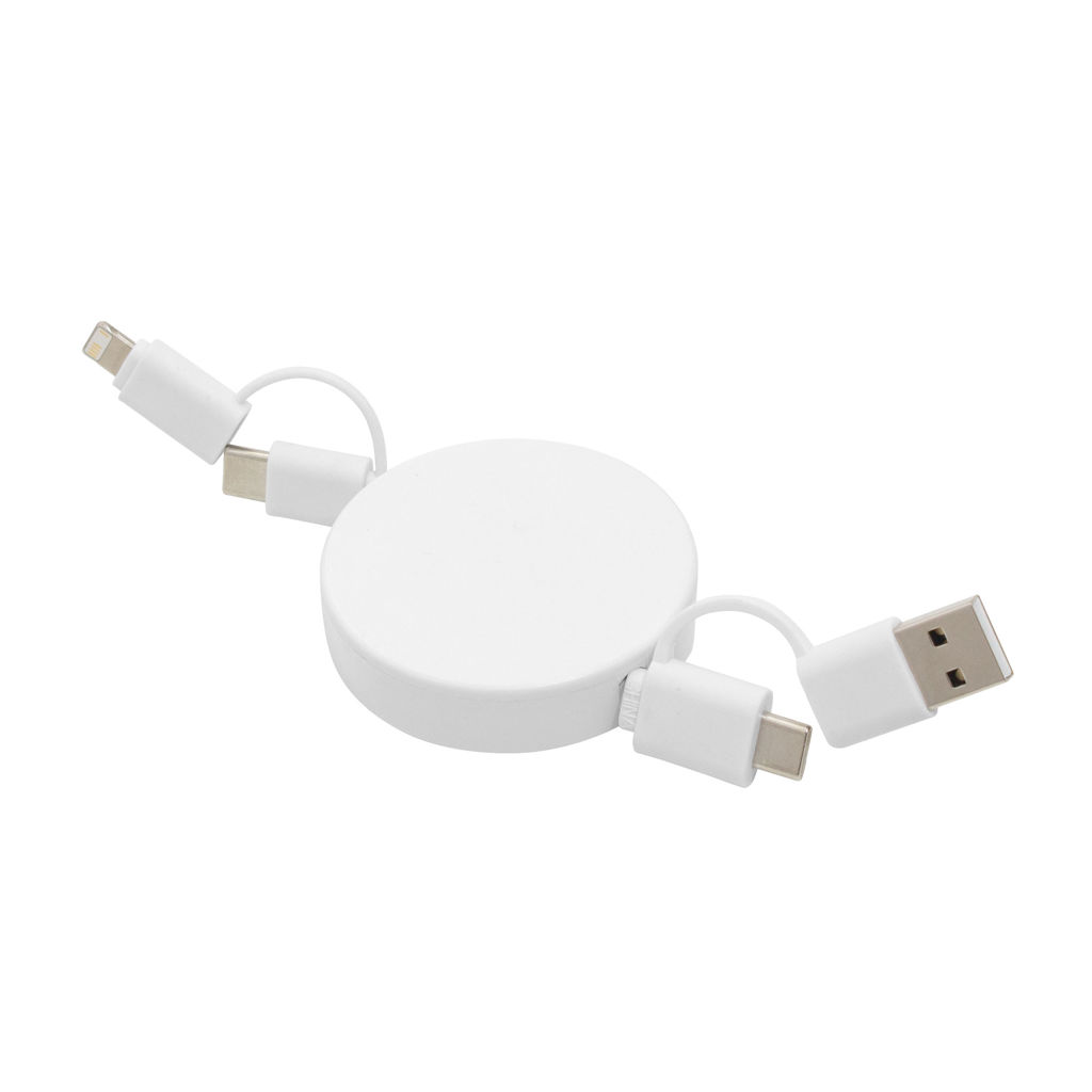 Llévalo a donde vayas.Cable de carga retráctil con longitud de hasta 90 cm. Carga y transferencia de datos de alta velocidad. Carga rápida de 65W. Entrada 2 en 1: USB y USB-C. Salida: 2 en 1: Lightning y USB-C. Diseño con acabado mateMedidas: Ø 5,3 x 1,3 cm.