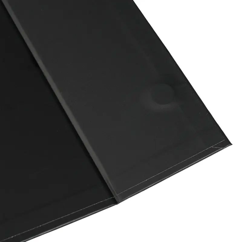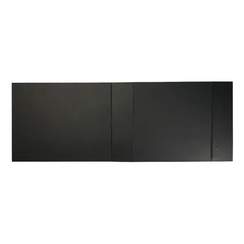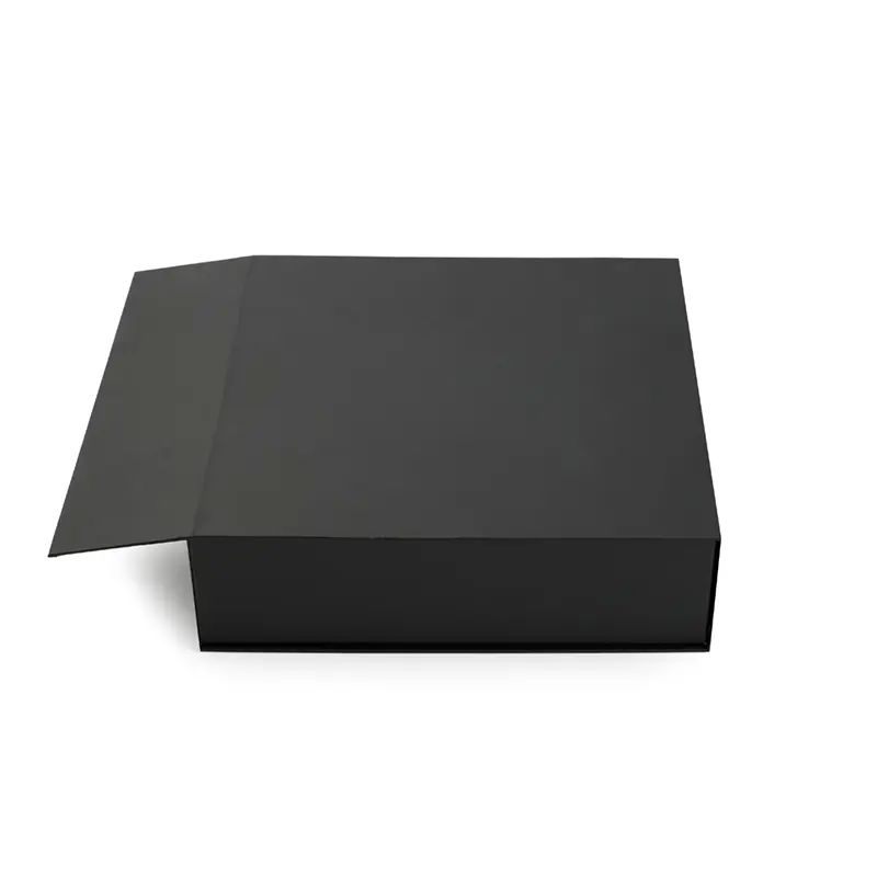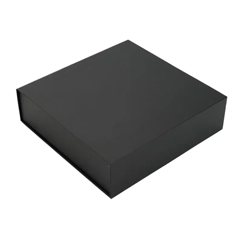 Caja plegable de cartón laminado mate en color negro, fabricada con materiales resistentes y diseño estructural reforzado. Cuenta con cierre magnético, esquinas con cinta adhesiva doble faz transparente para poder armarla y diseño plano que permite fácil almacenamiento y armado. Es ideal para presentaciones de productos, embalaje premium o uso como contenedor organizador en oficinas o eventos.