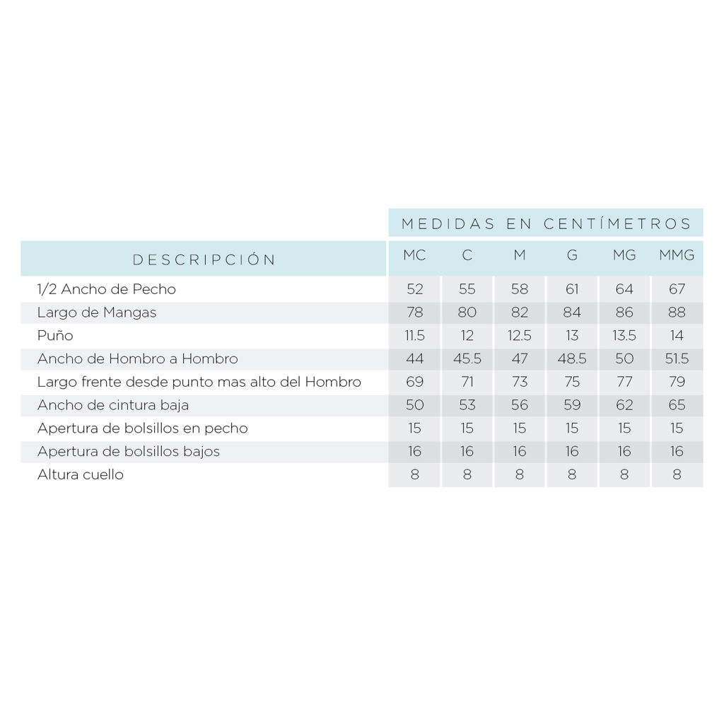 La campera cuenta con tres bolsillos con cierre, dos laterales inferiores y uno lateral derecho superior. La confección es una de las características de esta prenda, utilizando tapa costuras y detalles en sus terminaciones tanto exterior como interior. En el extremo superior del cierre, posee una solapa cobertora. La campera posee cuello alzado que proporciona protección y comodidad.
