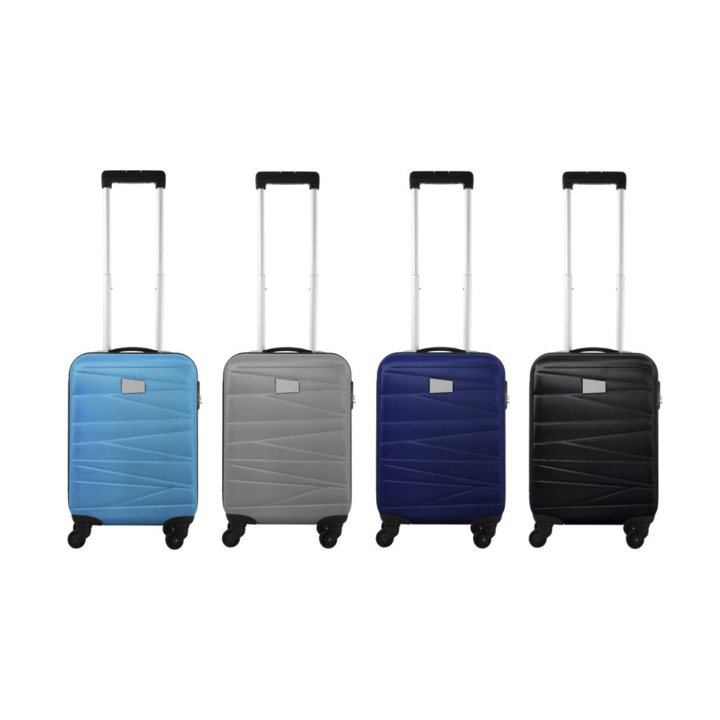 34 x 54 x 20 cm. (total). Capacidad 31 litros. ABS. Valija / Maleta pequeña. 4 ruedas con giro 360°. Manija de transporte reforzada. Mango extensible hasta 54 cm. 2 posiciones. Interior: 2 compartimentos principales con cierre y elásticos ajustables. Placa metálica desmontable para grabado (medida: 6 x 4 cm.) Candado incluido con combinación.
