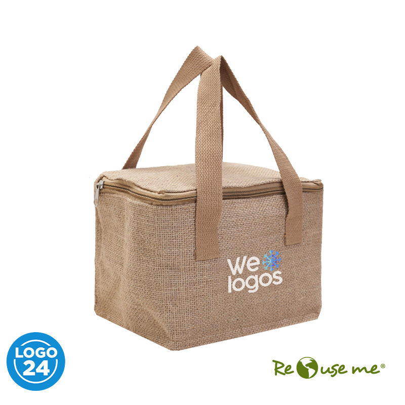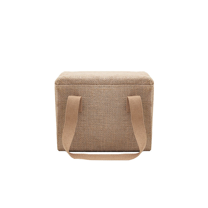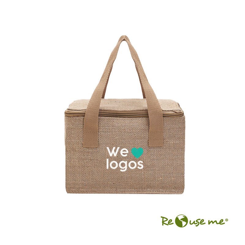 Cooler con exterior de Yute e interior térmico confeccionado en PEVA. Debido a la naturaleza rústica del material, el producto puede presentar imperfecciones. Medidas: 20.5 x 15 x 16 cm. ReUseMe.
