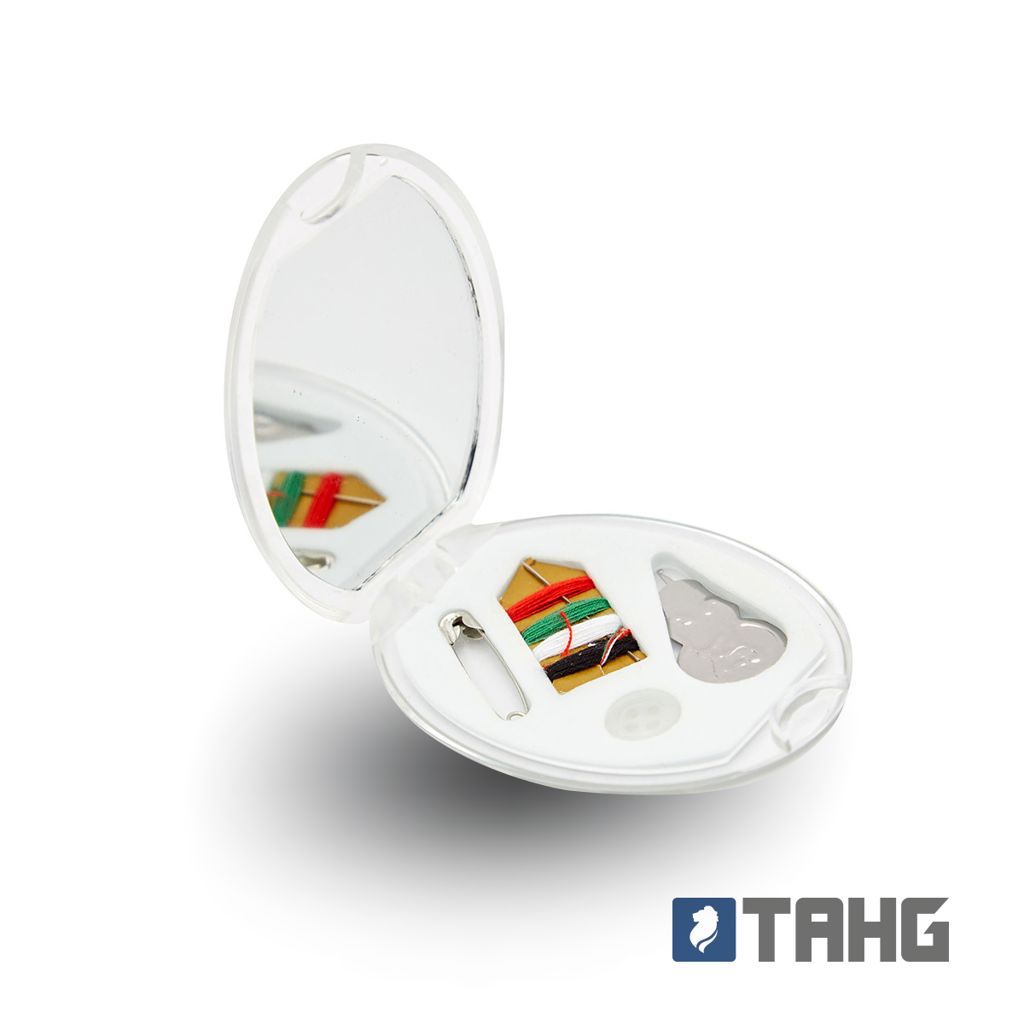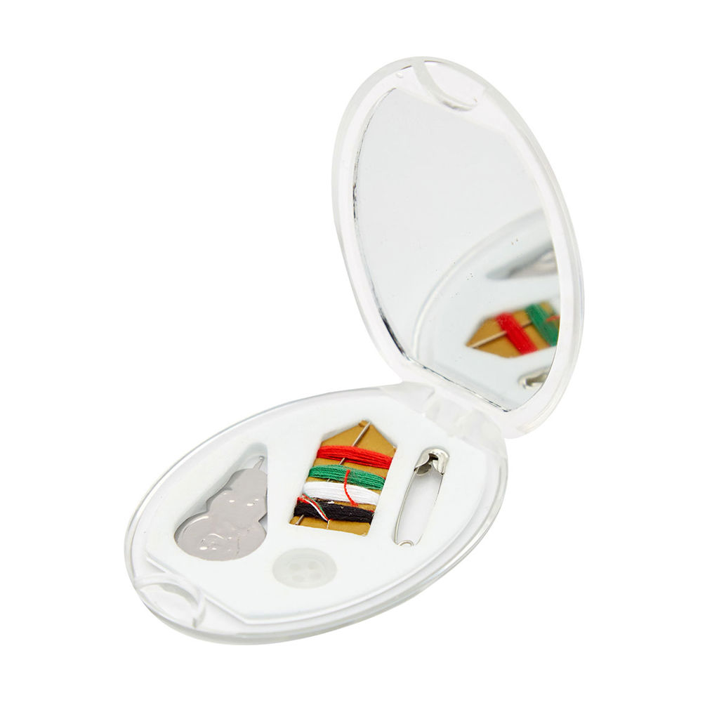 Mini costurero de viaje de plástico Incluye: Espejo, aguja con 4 tonos de hilo, botón y alfiler de gancho. Medidas: 5,5 x 8 cm. Tahg