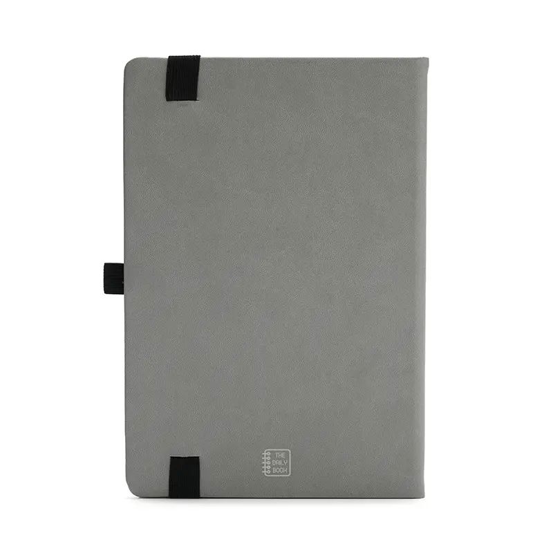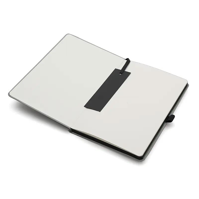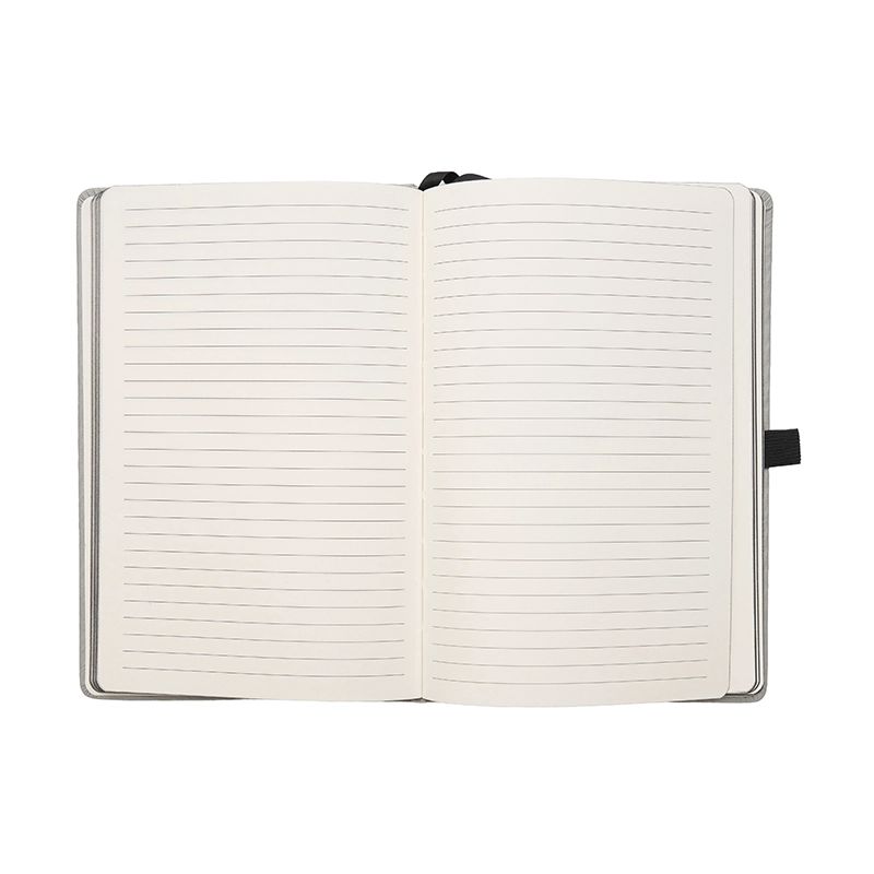 Cuaderno con tapa dura confeccionada en PU (poliuretano) color gris. Cuenta con 96 hojas rayadas de 70 g, perfectas para tomar notas, escribir ideas o planificar la jornada e incluye cinta señaladora.