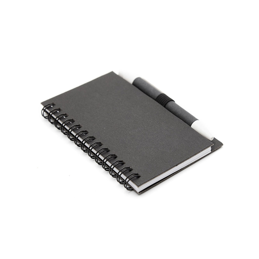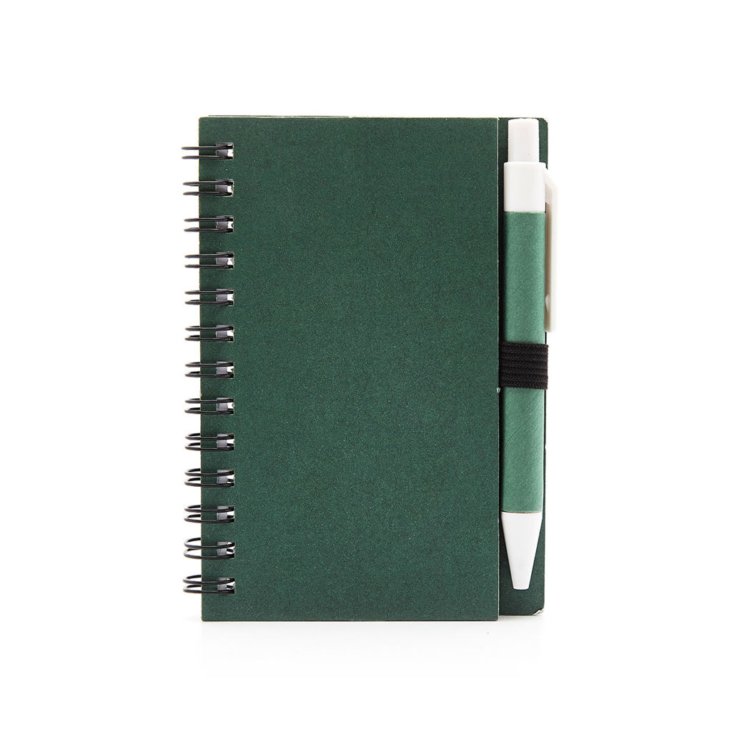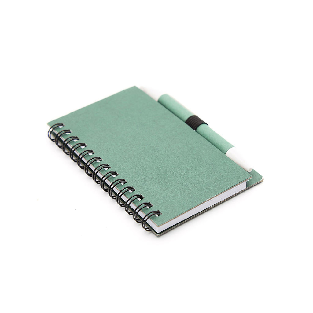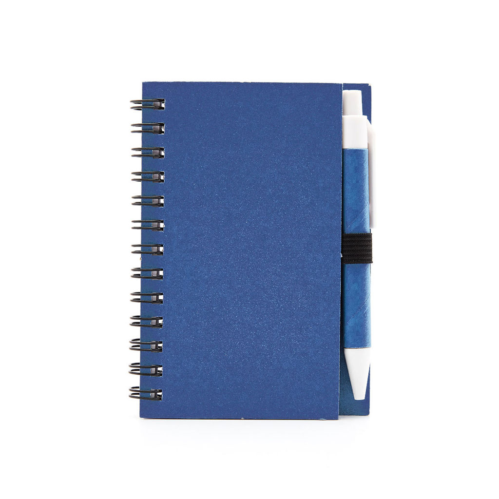 Cuaderno anillado colors tamaño A6 con 50 hojas lisas de 80 grm. Realizado con tapa dura elaborada en cartón reciclado. Incluye bolígrafo con pulsador (Tinta Negra). Medidas: 8 x 12 cm.