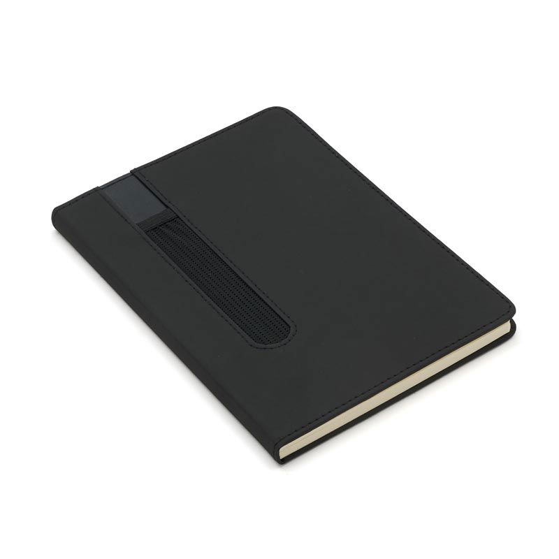 Cuaderno de 80 hojas lisas de 70 gr con tapa dura de cartón reciclado recubierto de PU. Cuenta con marcador de páginas color negro y, su tapa posee elástico porta lapicera. Encuadernación cosida.