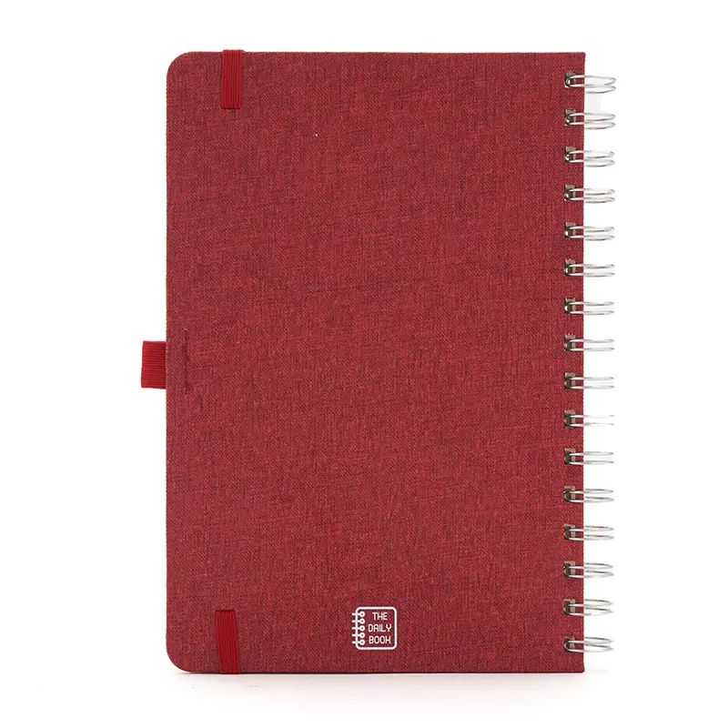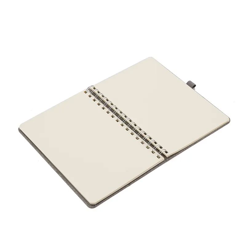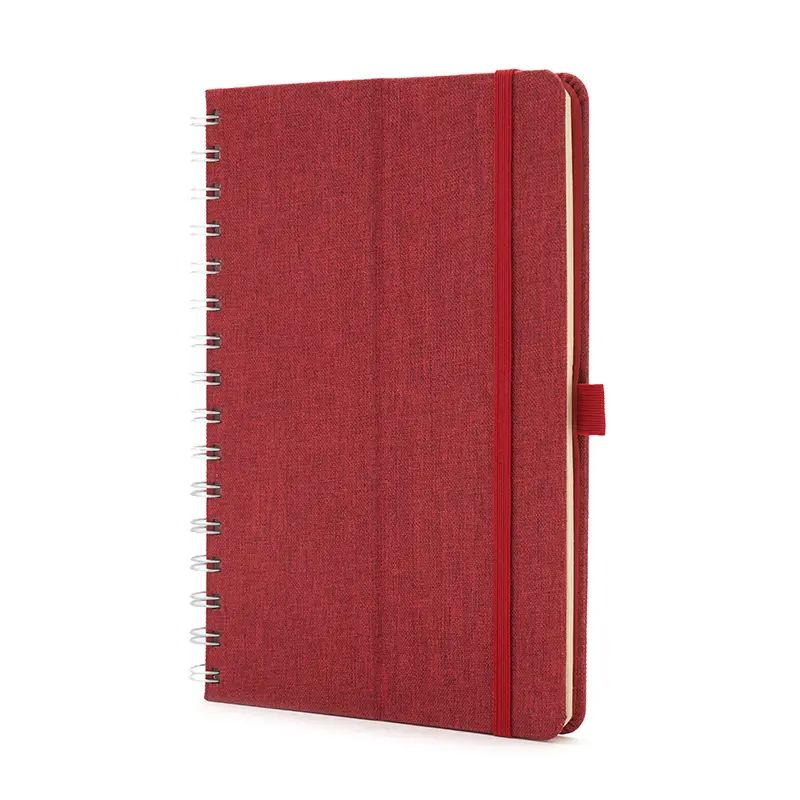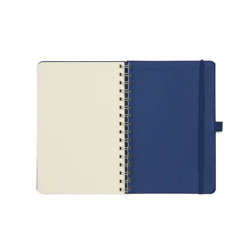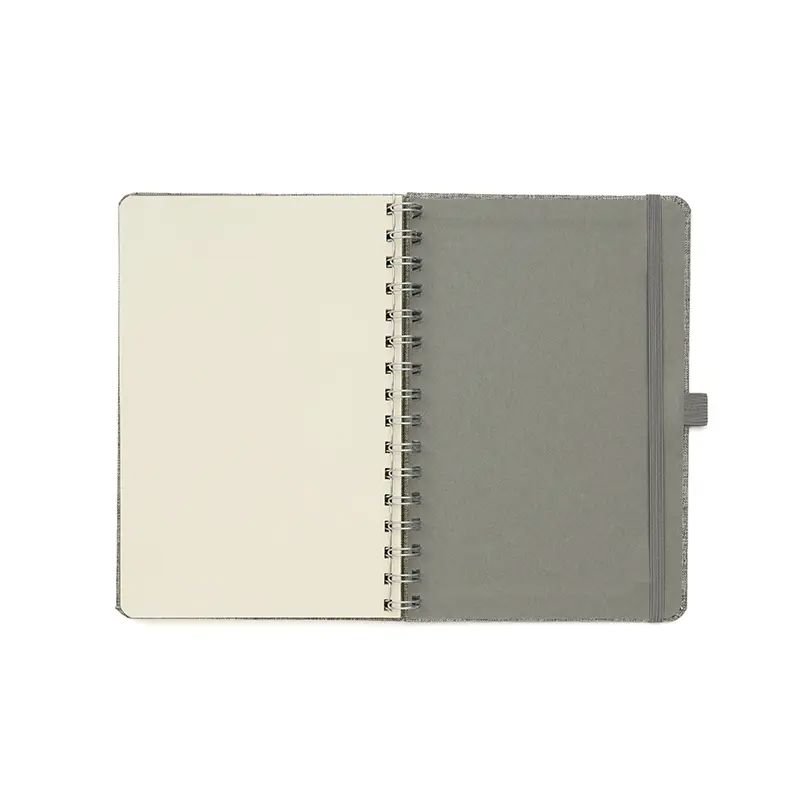 Cuaderno anillado de 80 hojas lisas de 70gr. Tapa dura confeccionada en RPET, material hecho con botellas de plástico recicladas. Su tapa delantera puede doblarse, creando un soporte para teléfono. Cuenta con cierre elástico y porta lapicera.