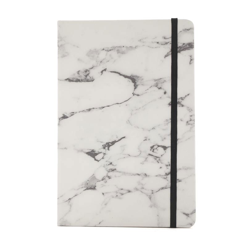 Cuaderno A5 con 80 hojas lisas de 70gr de tapa dura de PU con estampa simil mármol. Cuenta con cierre elástico y marcador de páginas color negro. Encuadernación cosida.