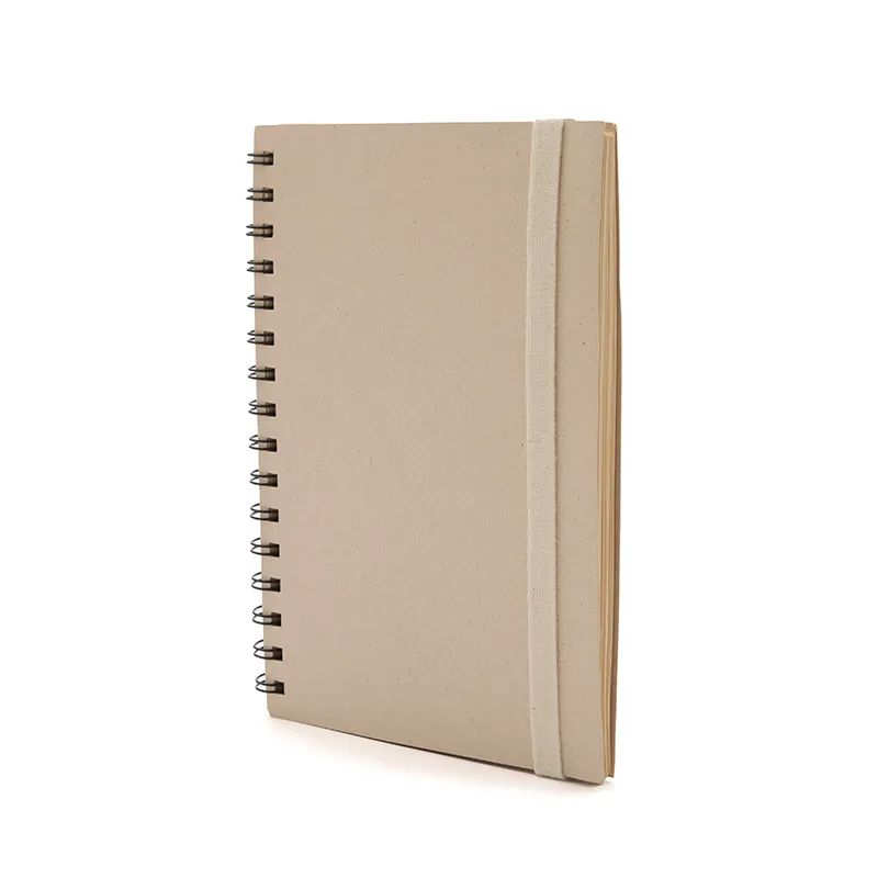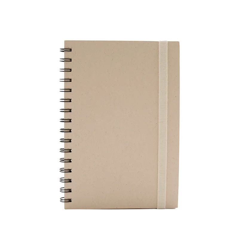 Cuaderno A5 con espiral hecho de papel de fibra de caña de azúcar fabricado en materiales sostenibles cuenta con 80 hojas rayadas de 90 gramos elástico de cierre marcador y diseño ecológico es ideal para tomar notas de manera consciente en entornos laborales académicos o personales.