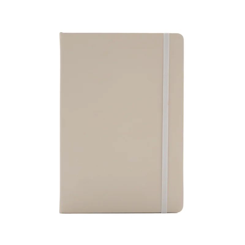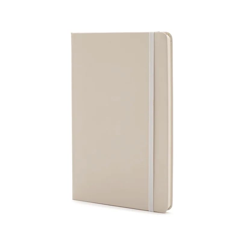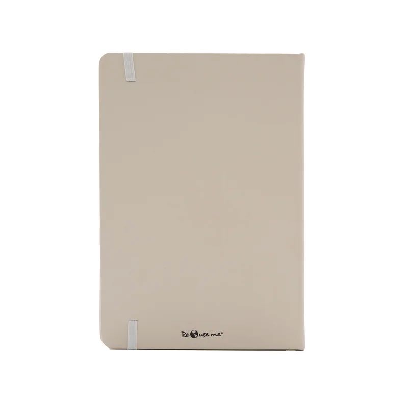 Cuaderno A5 con tapa bio-based hecho de fibra de maíz y papel reciclado fabricado en un 56% con PU derivado de fibra de maíz y hojas de papel 100% reciclado con certificación FSC cuenta con 80 hojas rayadas de 80 gramos cinta señaladora elástico de cierre y diseño sustentable es ideal para escribir tomar notas o regalar en entornos comprometidos con el medio ambiente.