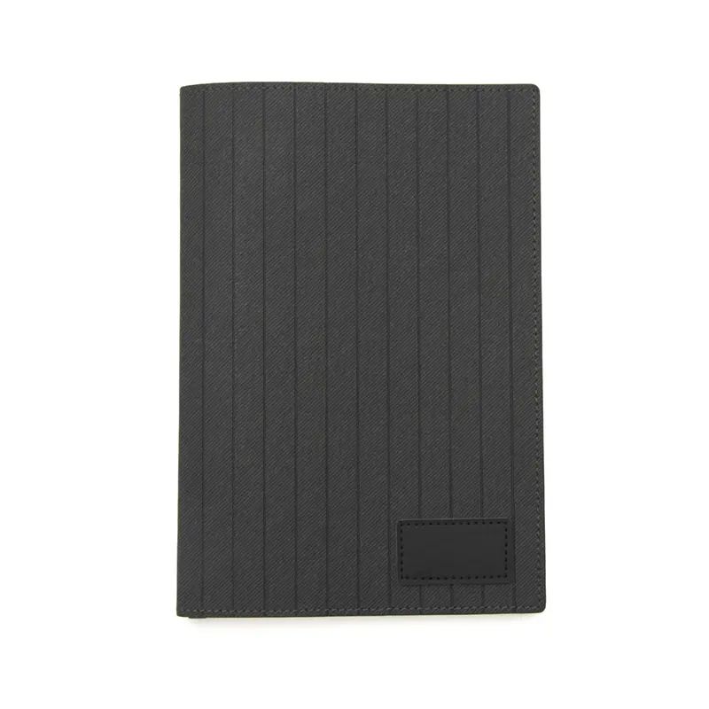 Cuaderno A5 fabricado en PU color gris oscuro. Cuenta con diseño lineado en la tapa frontal, cinta señaladora negra, 100 hojas rayadas de papel ivory y espacio para personalización. Es ideal para anotaciones diarias, uso corporativo, estudios o como regalo institucional elegante y funcional.
