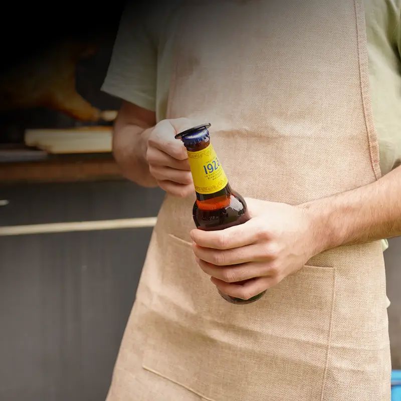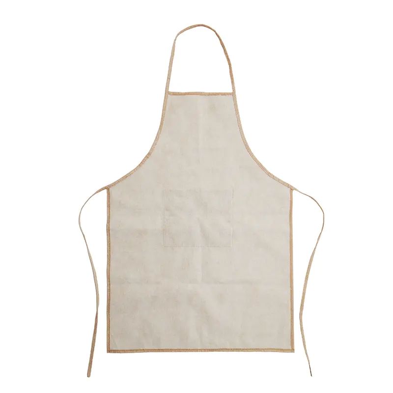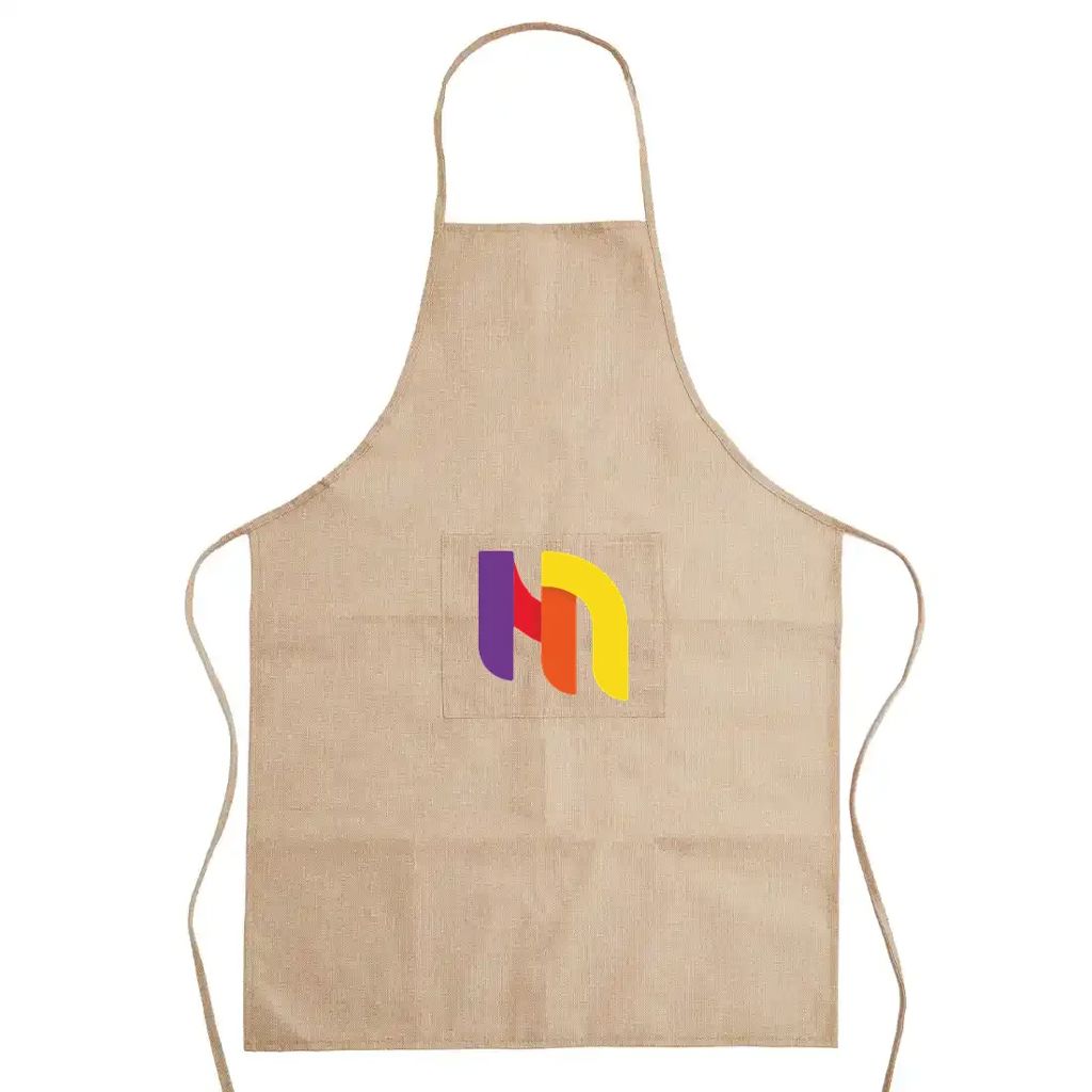 El delantal de ReUseMe está confeccionado en tela de Jute laminada con TNT, tela no tejida. Cuenta con dos tiras regulables para atar en la cintura y un bolsillo frontal. ReUseMe