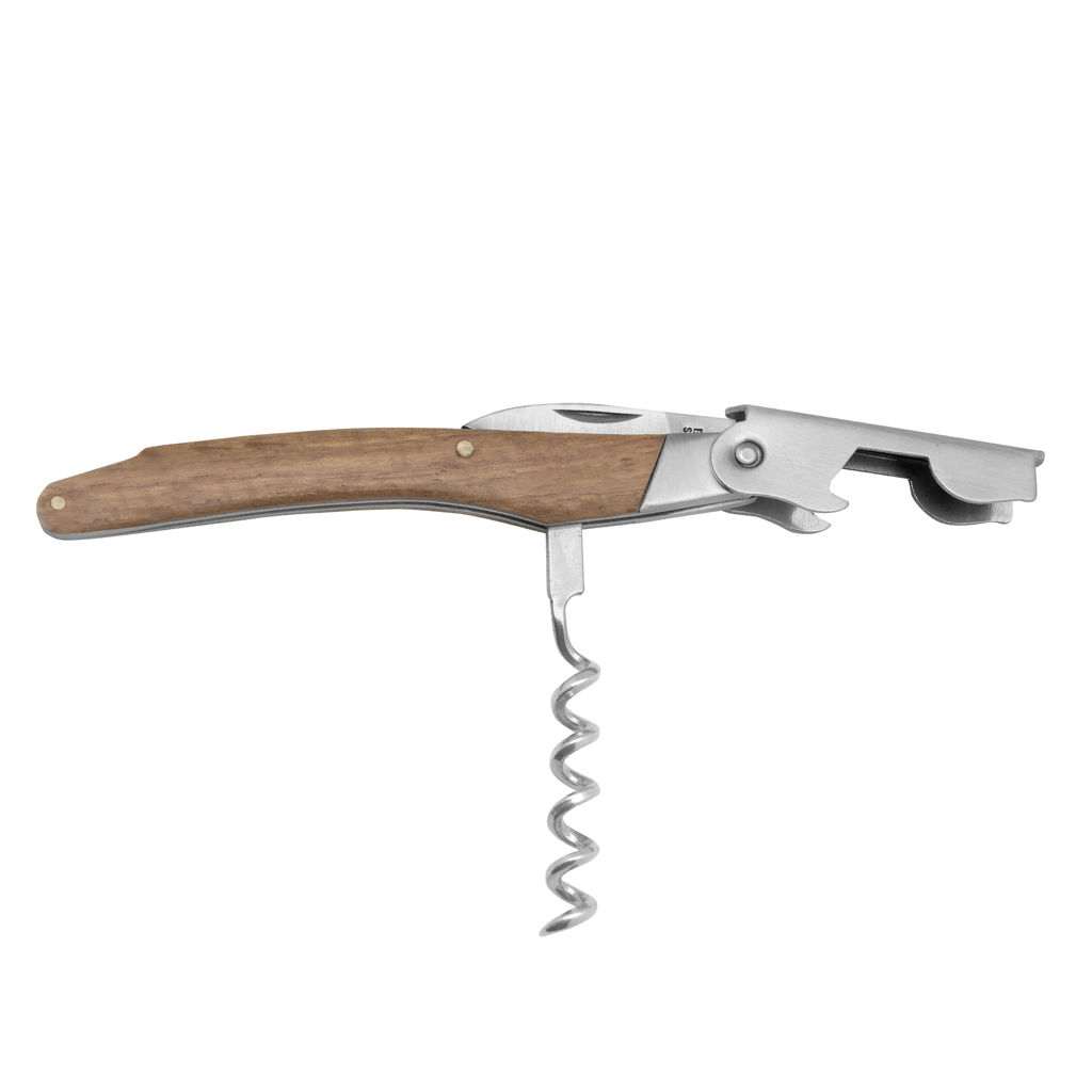 11,6 cm. Acero inoxidable. Peso: 68g. Abridor de botellas de vino en acero inoxidable con mango de madera en color natural. Accesorios incorporados: sacacorchos, navaja y destapador. Presentación en caja de regalo.