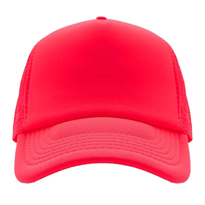 Gorro de 5 paneles en poliéster con parte trasera de tela de red. Disponible en colores fluorescentes: rosa, verde, amarillo, naranja y combinaciones de estos con blanco. Ajuste con broche plástico.